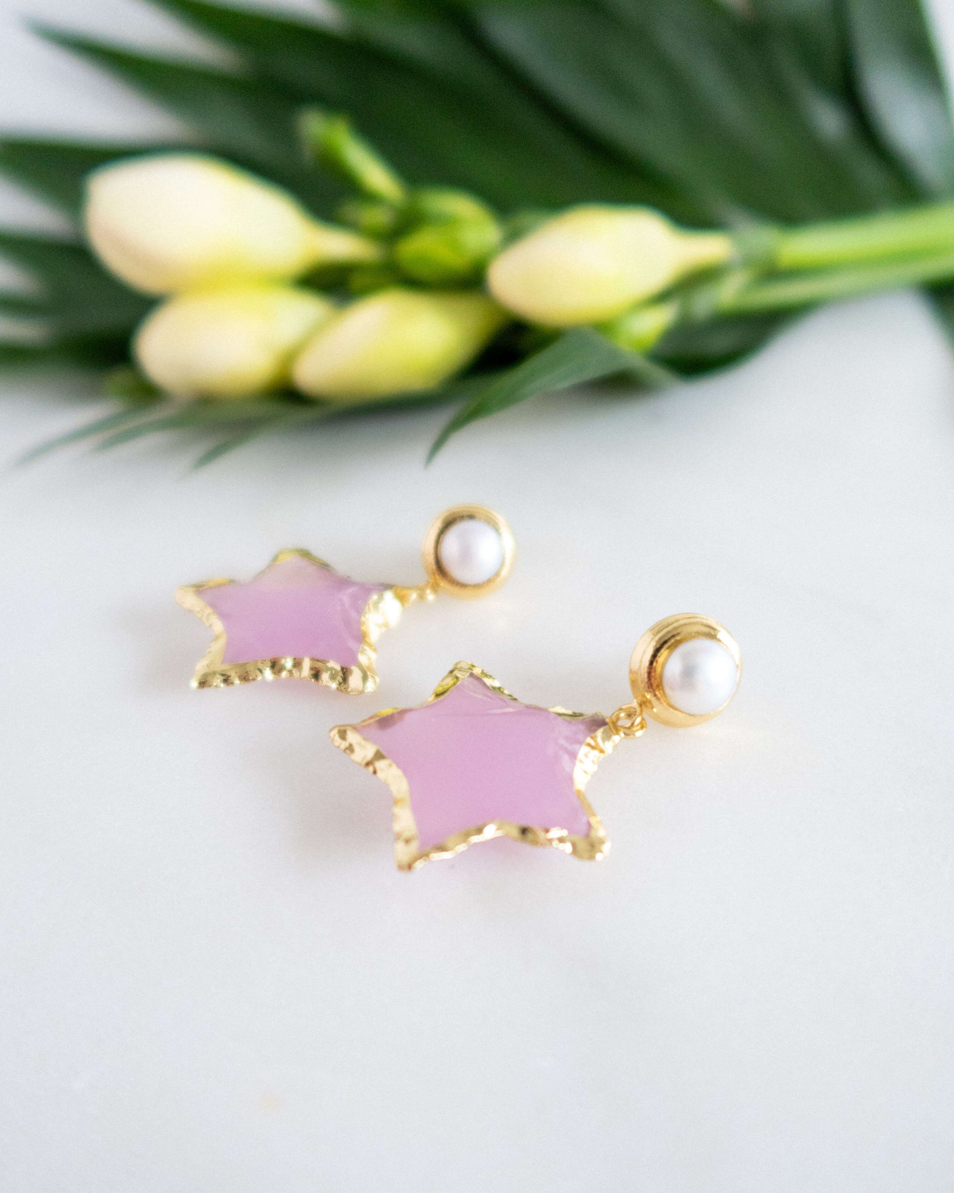 - Cercei ușori cu stele din cuarț roz de sinteză electroplacate cu aur 18 karate