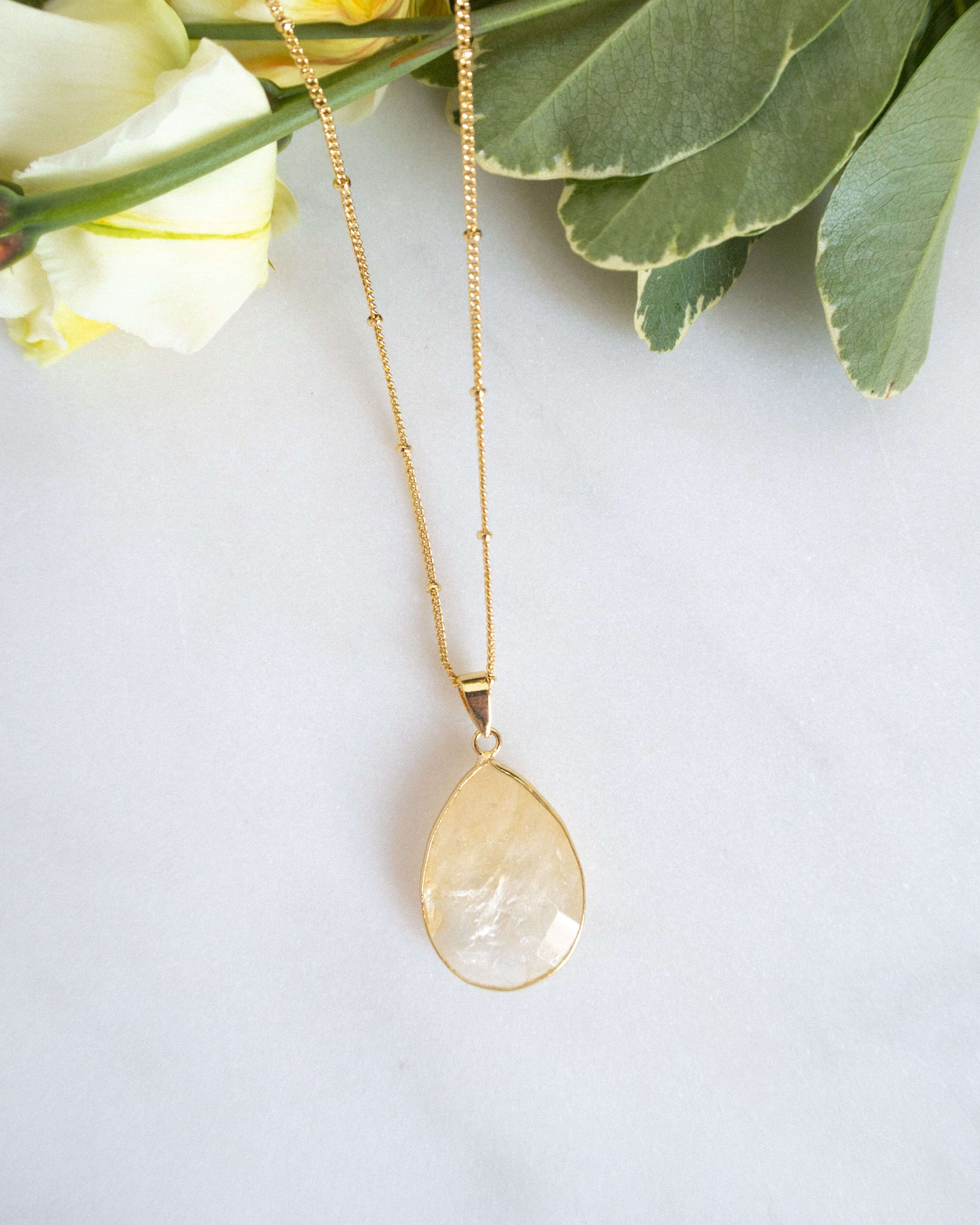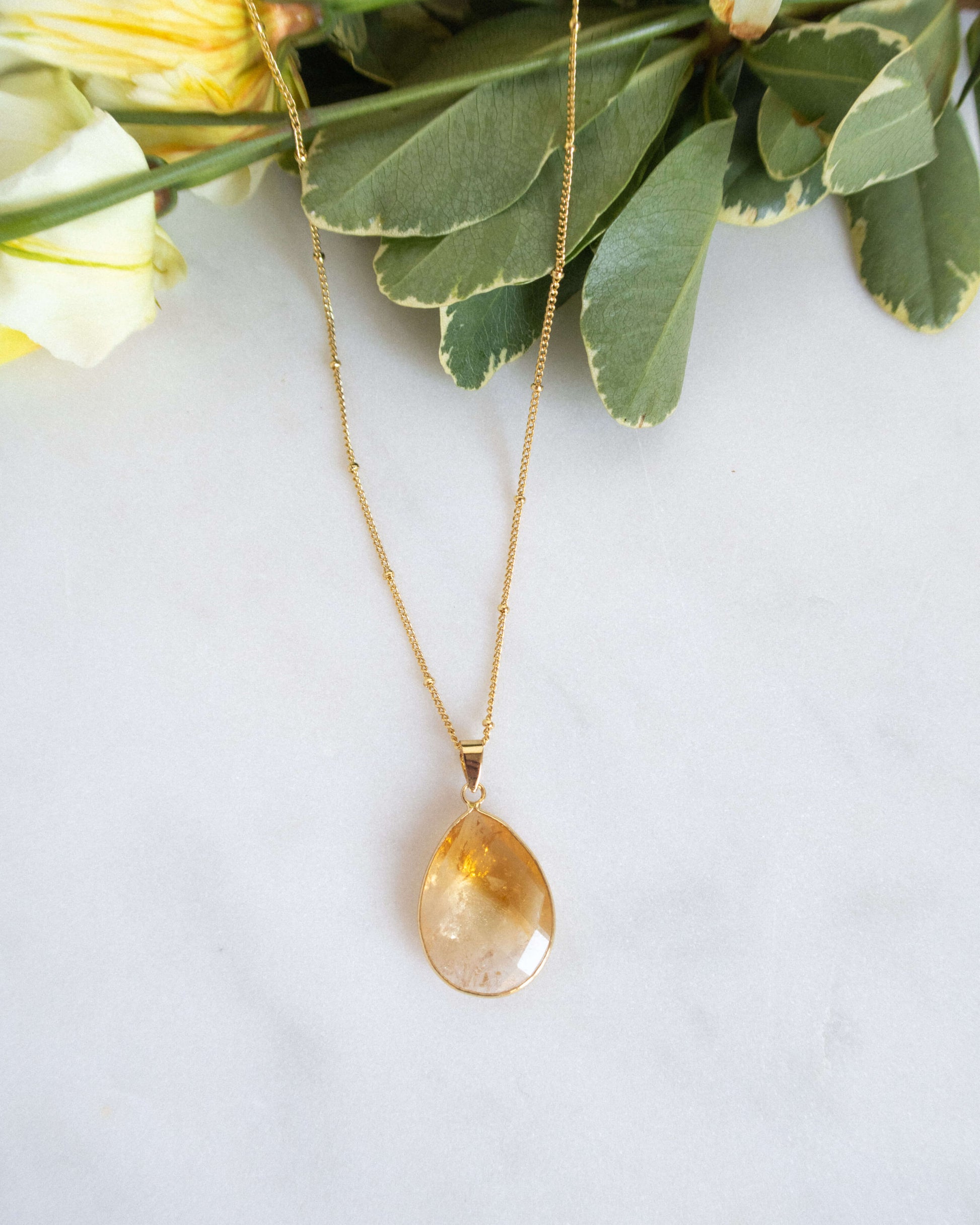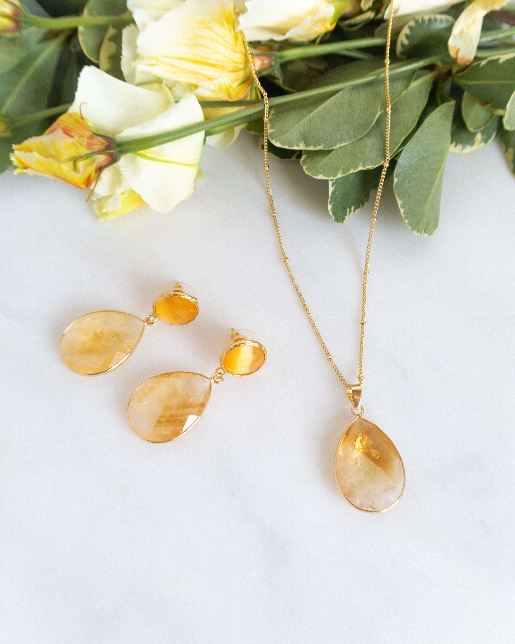 - Colier cu pandant cu 2 fețe din citrin, alamă electroplacată cu aur 18 karate