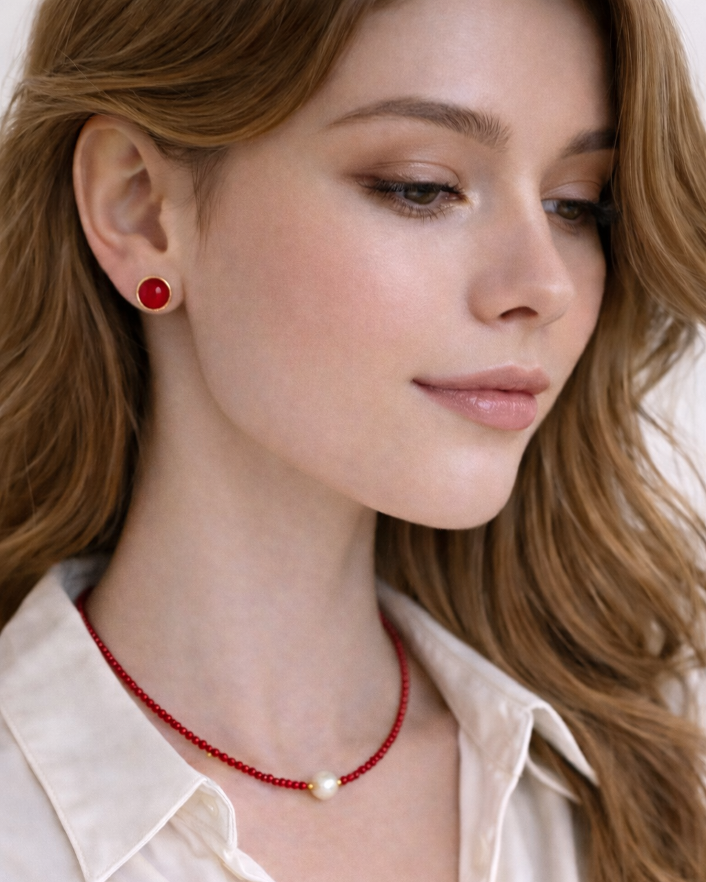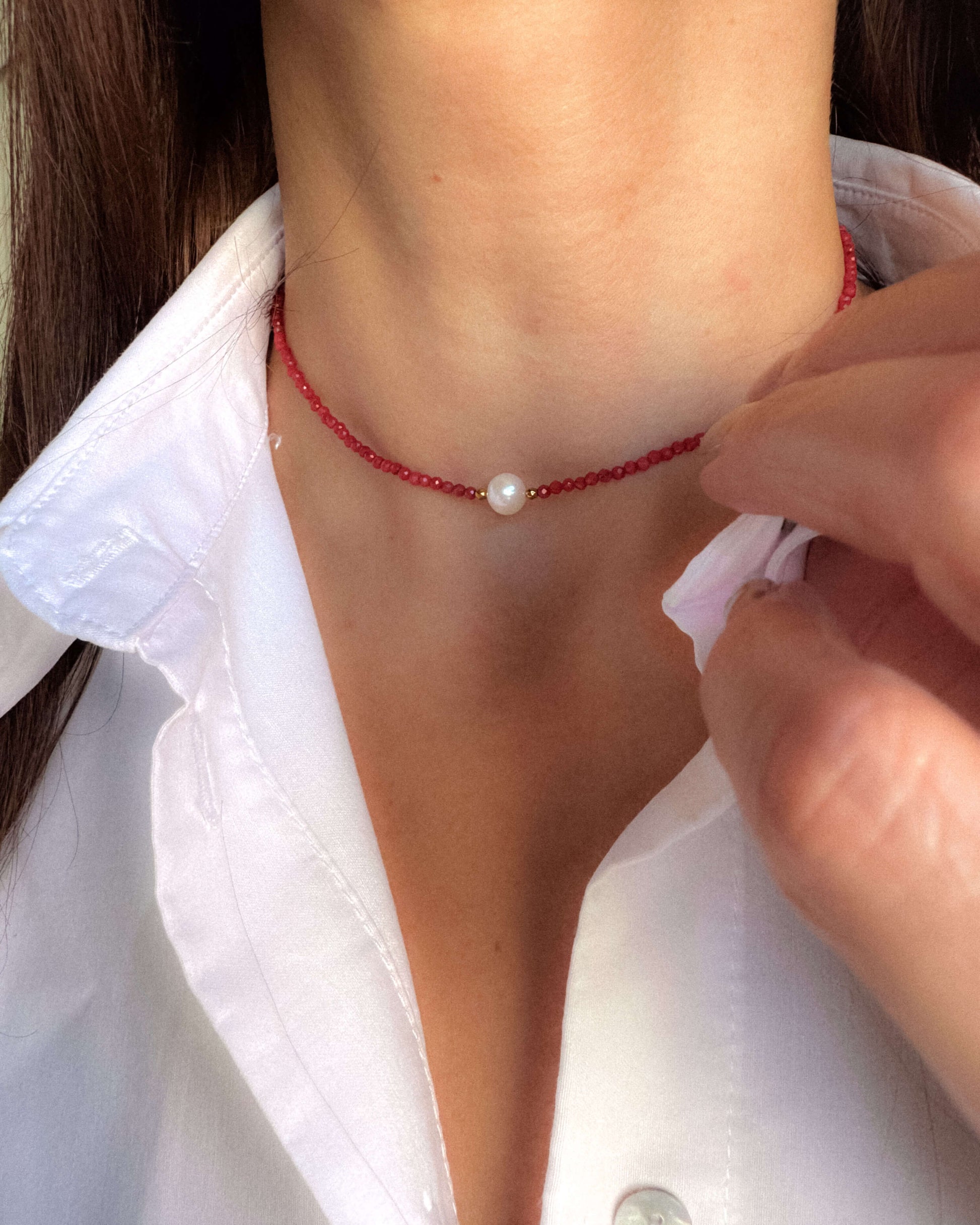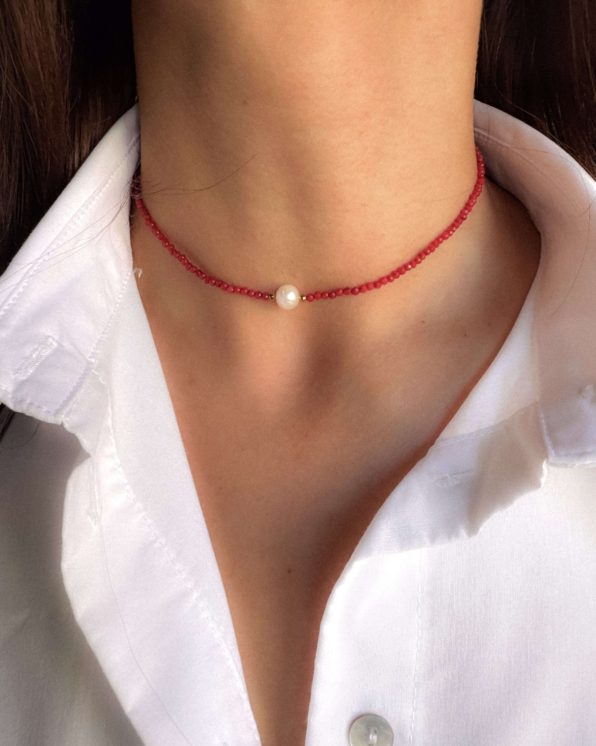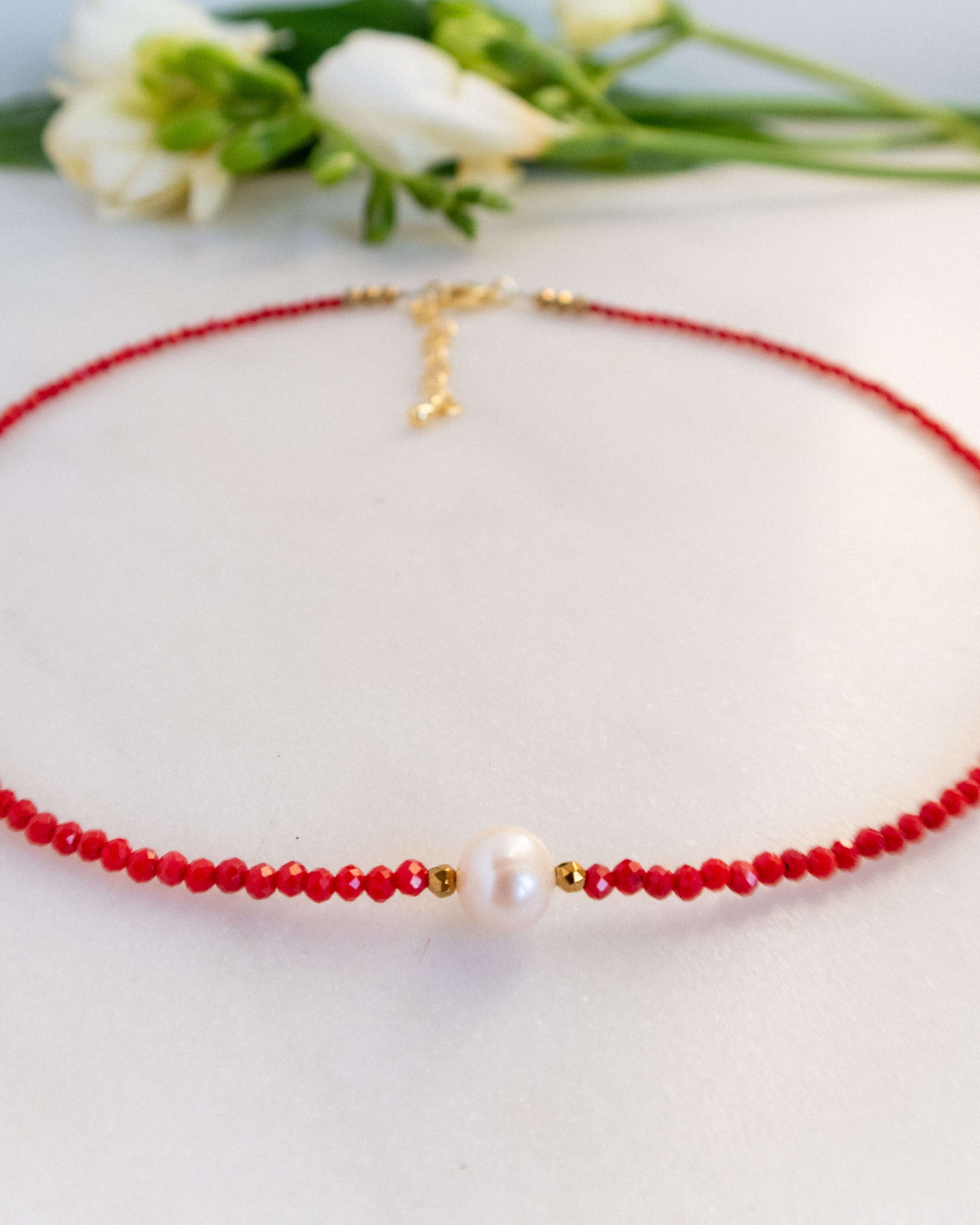 - Colier din coral roșu de 2,5 mm, perlă naturală de cultură de 4-6 mm și hematite de 2,5 și 3 mm pe fir din inox siliconat