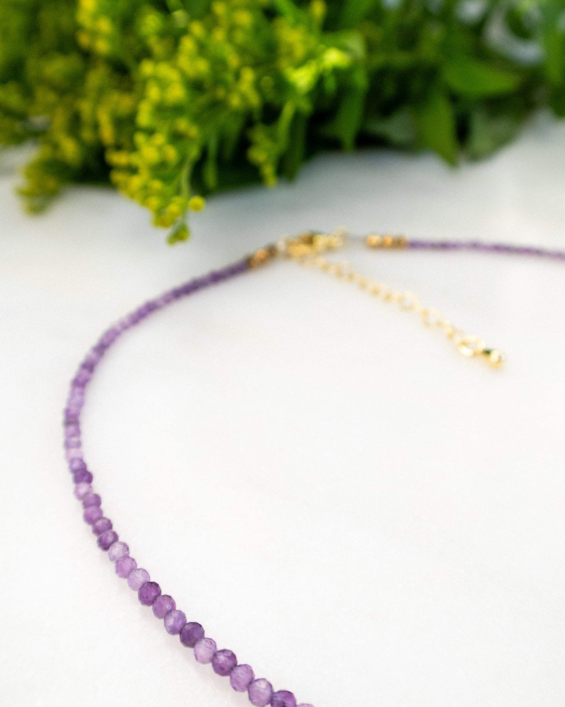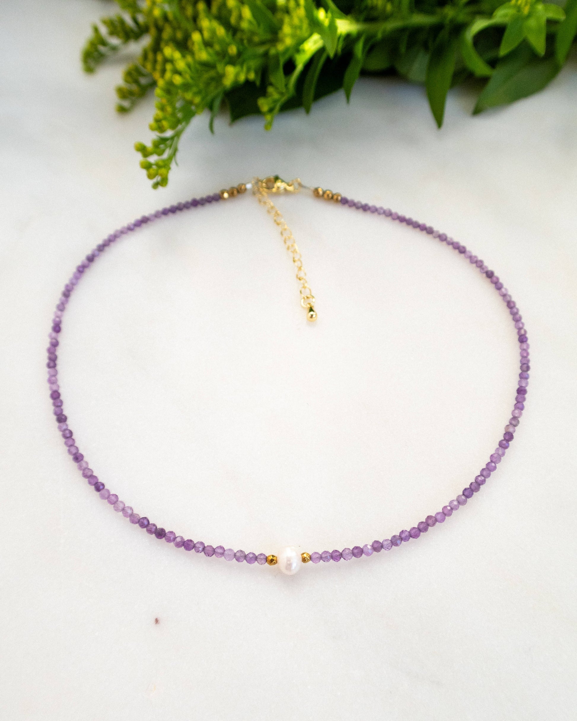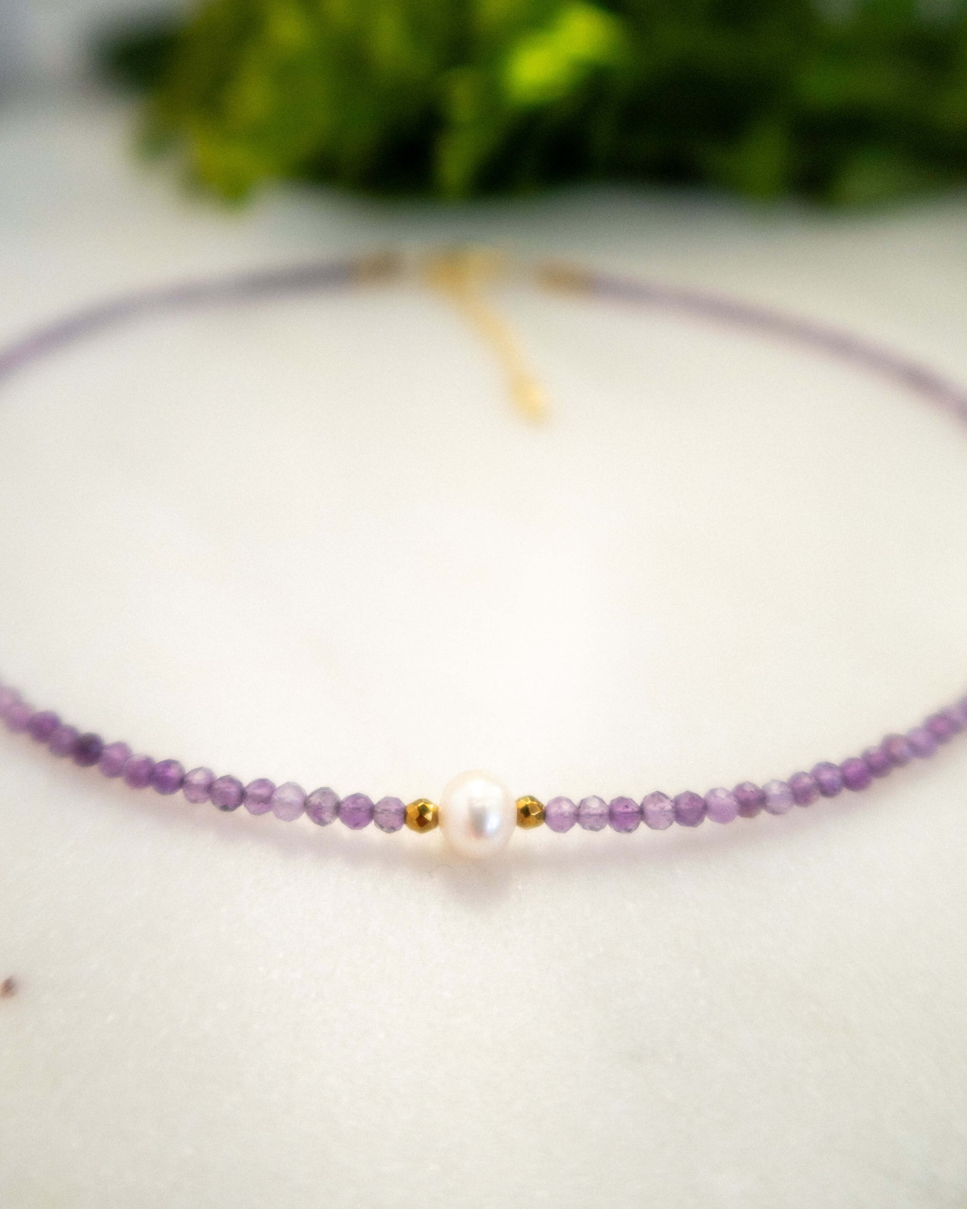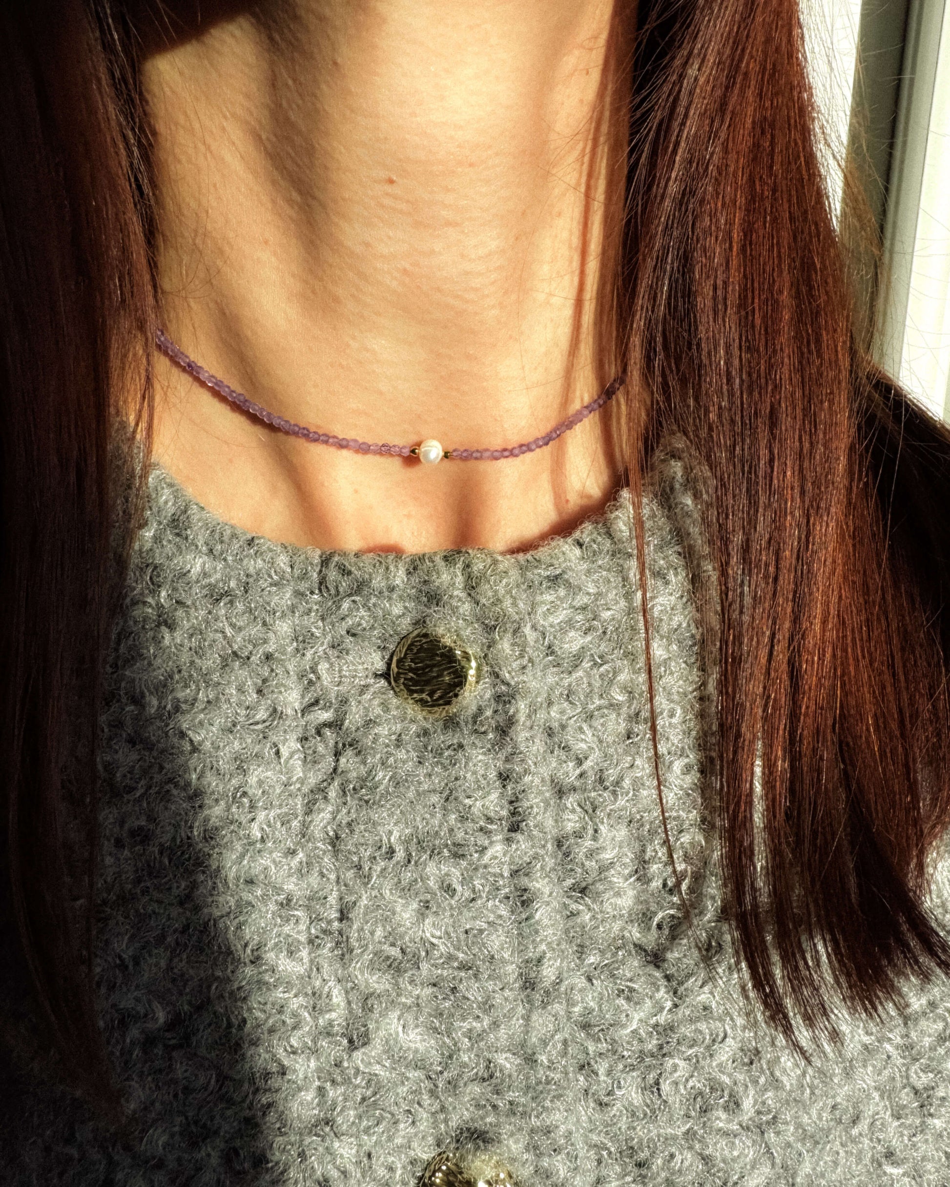 - Colier din ametist de 2,5 mm, perlă naturală de cultură de 4-6 mm și hematite de 2,5 mm pe fir din inox siliconat