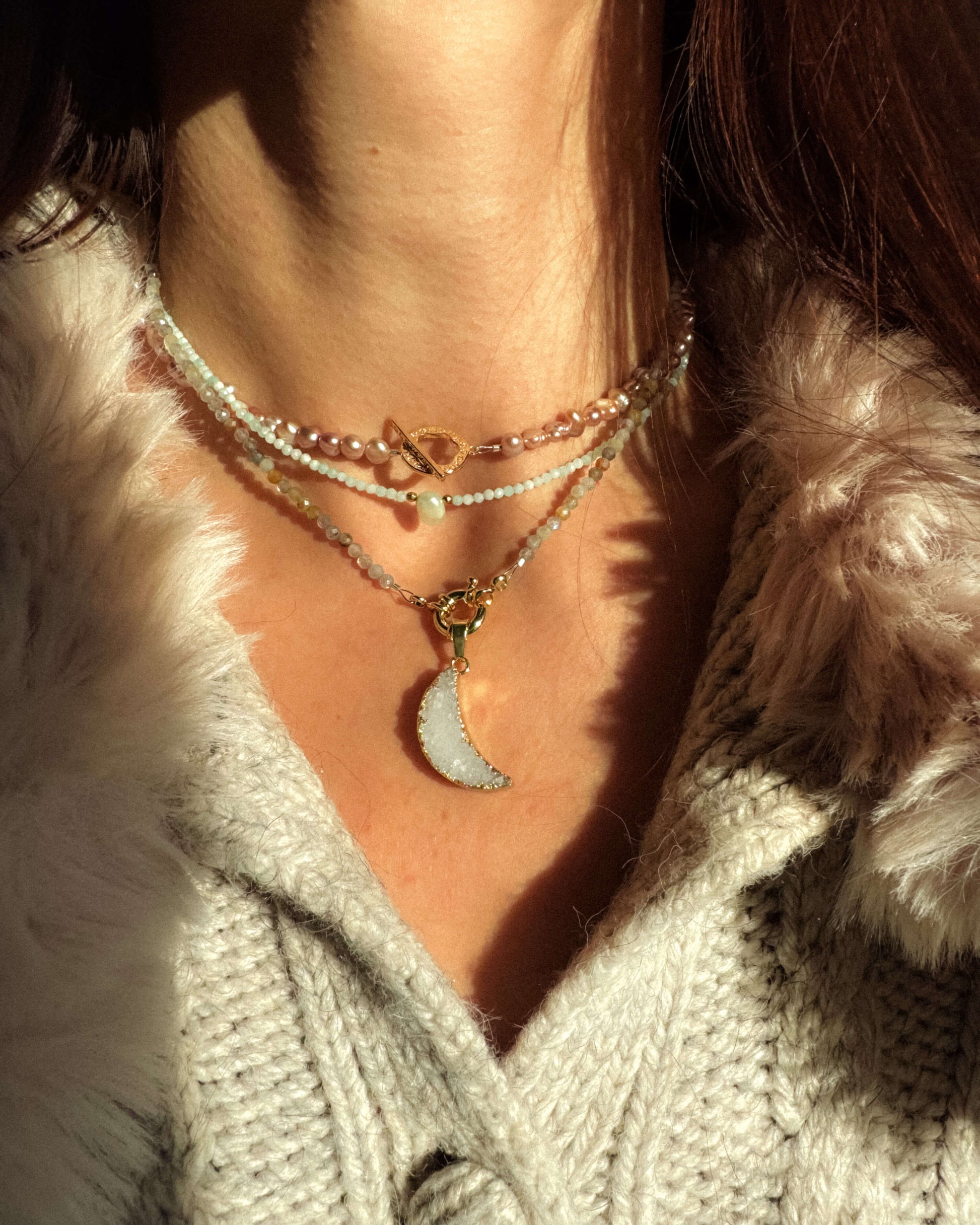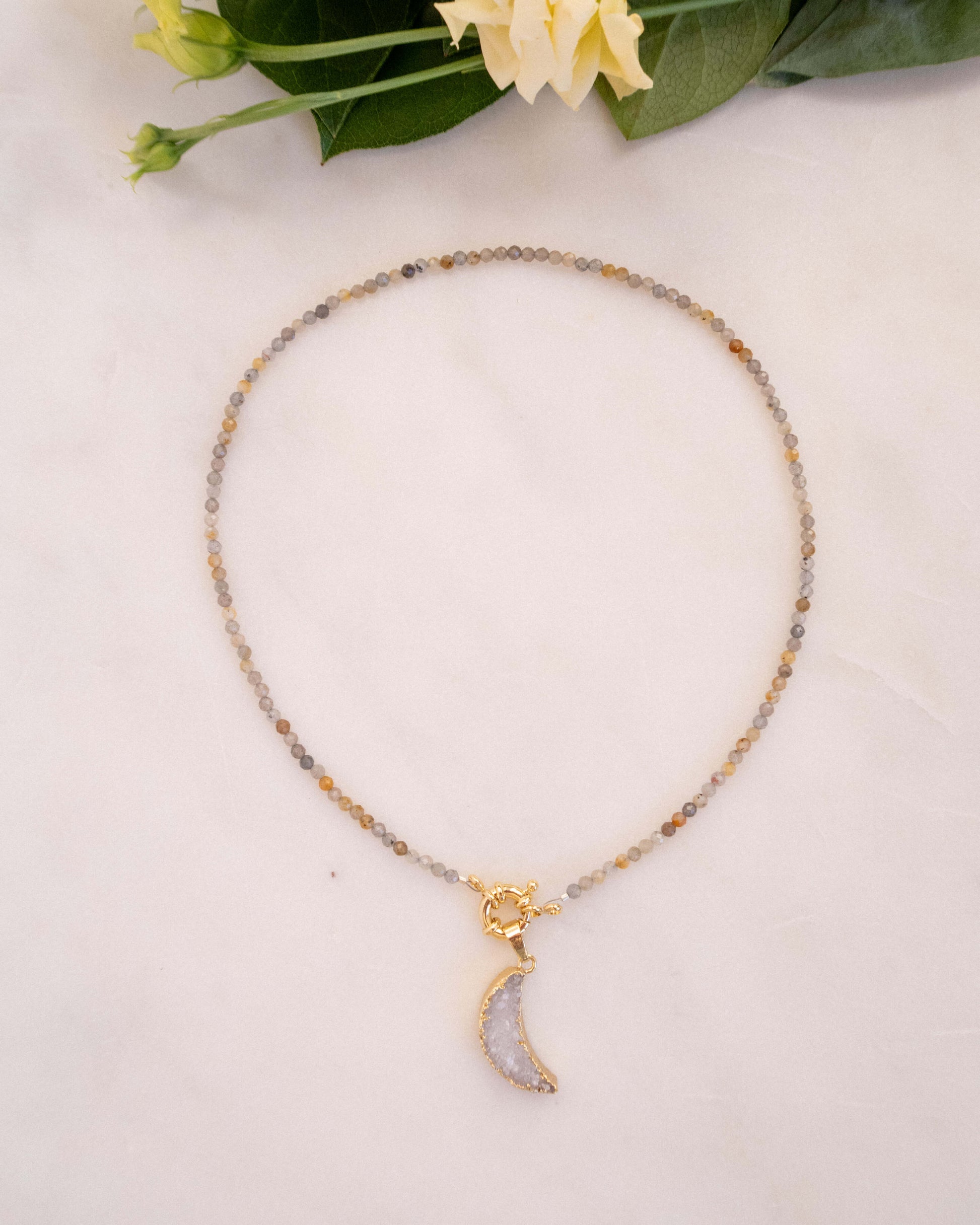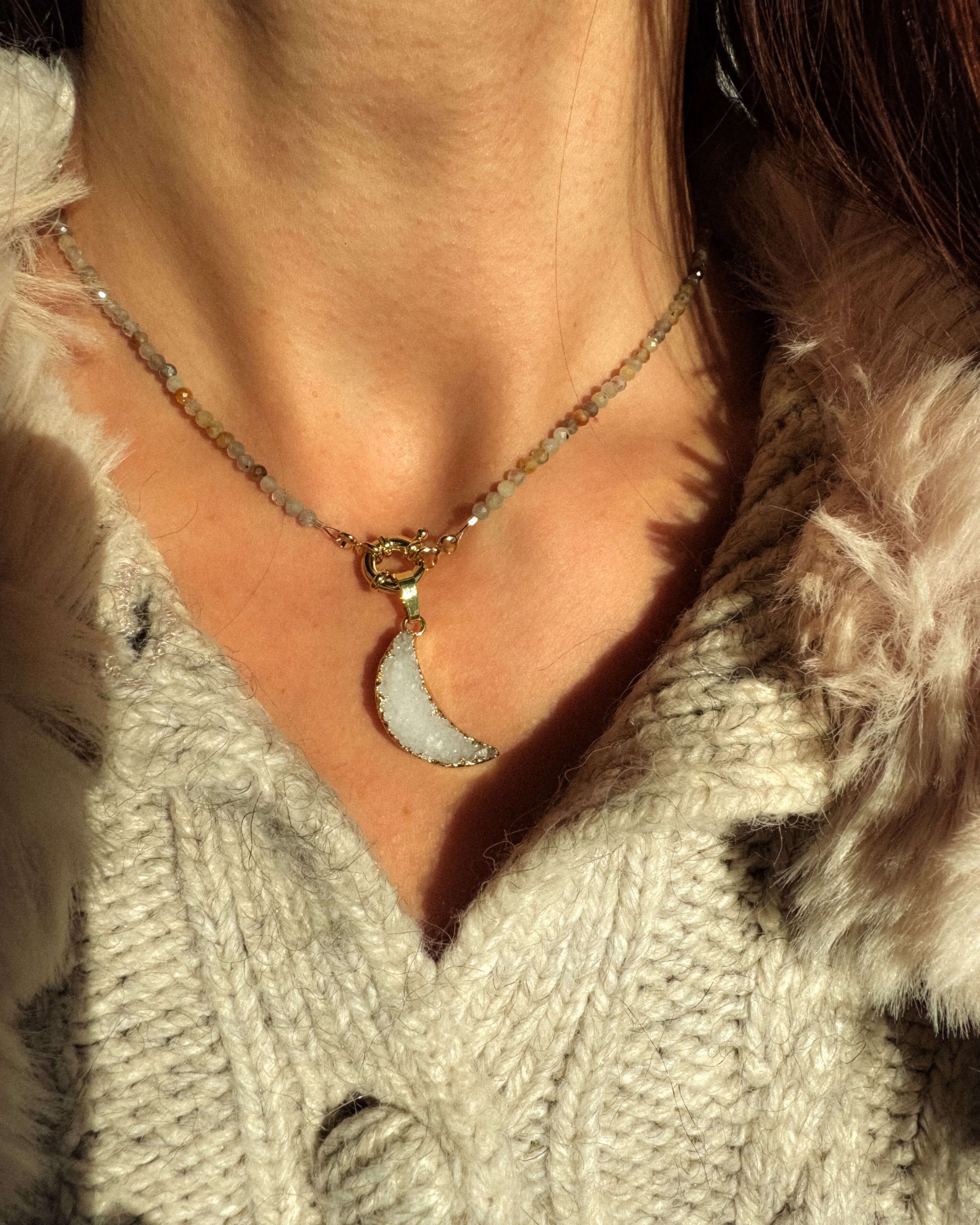 - Pandant semilună din cuarț, alamă electroplacată cu aur 18 karate
