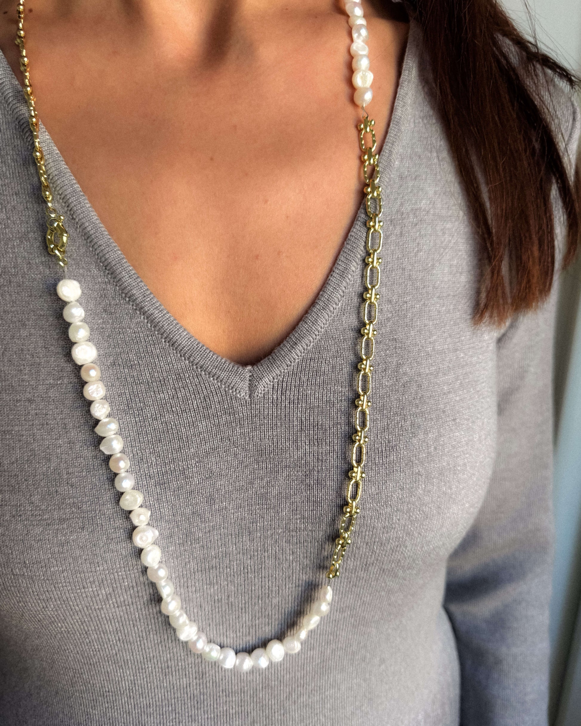 - Colier lung unicat din perle naturale de cultură de 7-9 mm, lanț din alamă electroplacată cu aur 18 karate