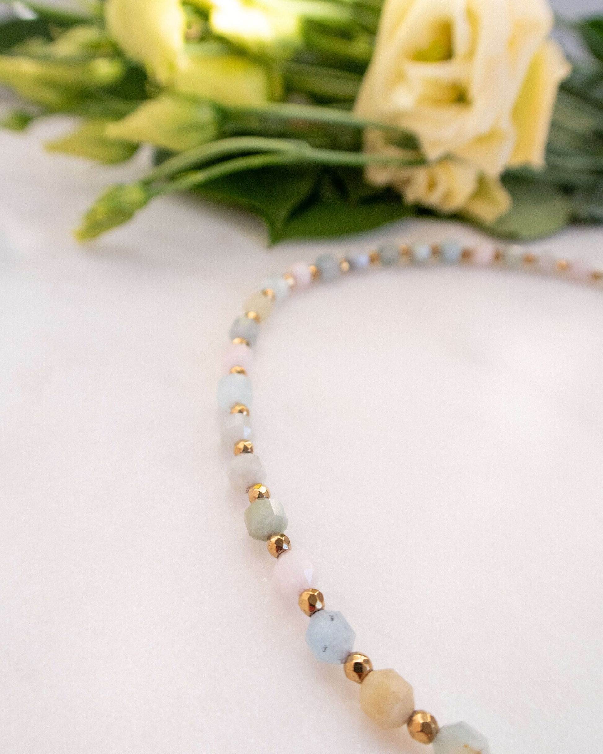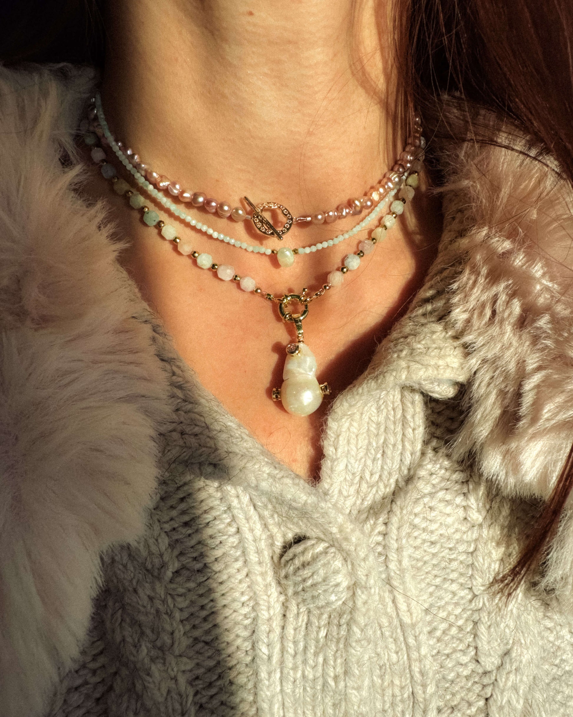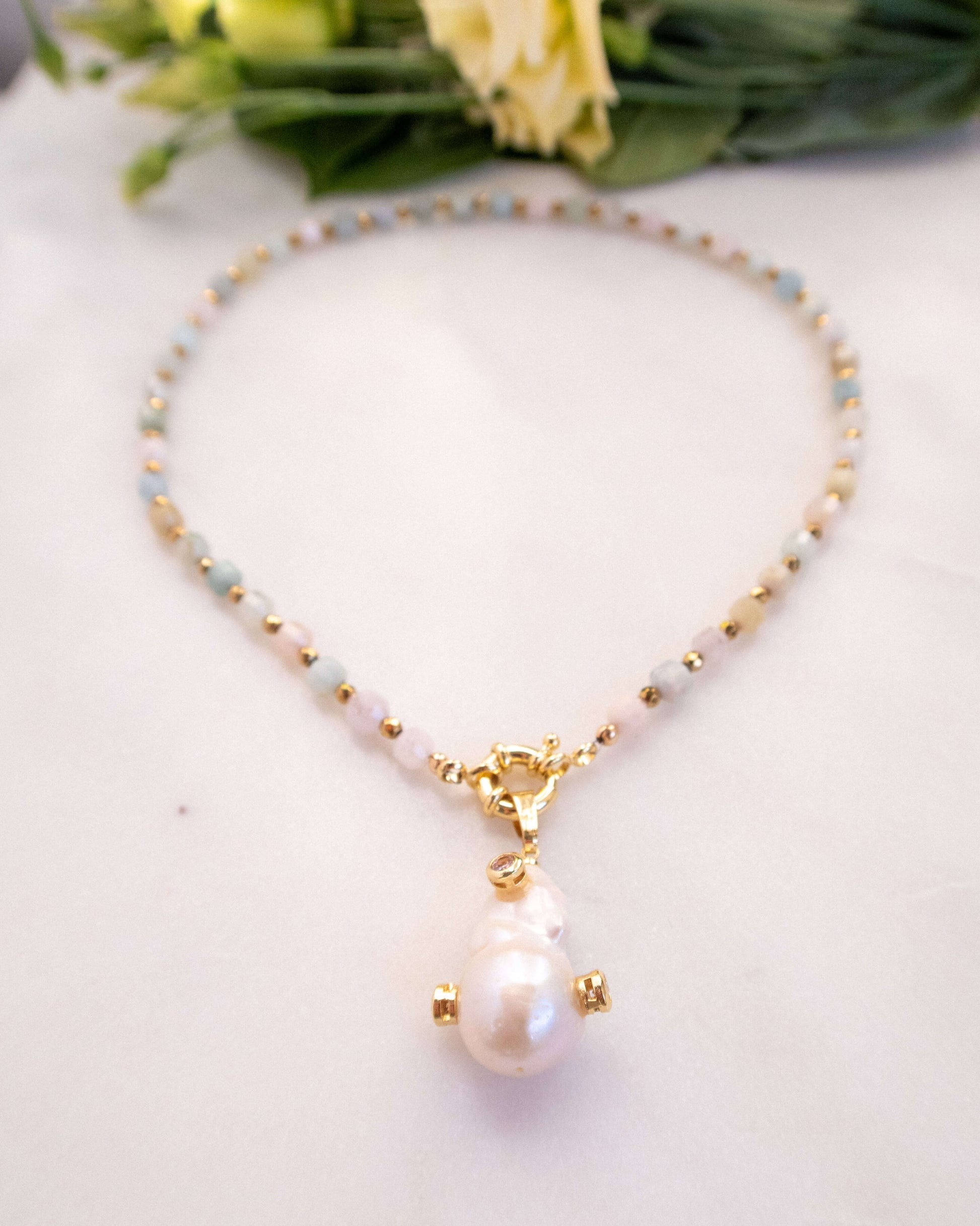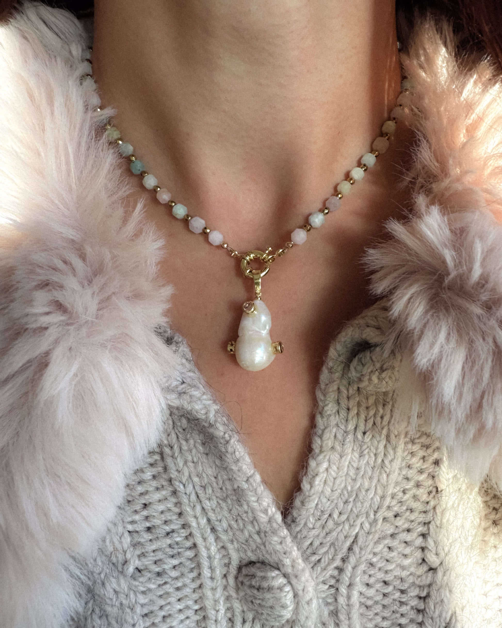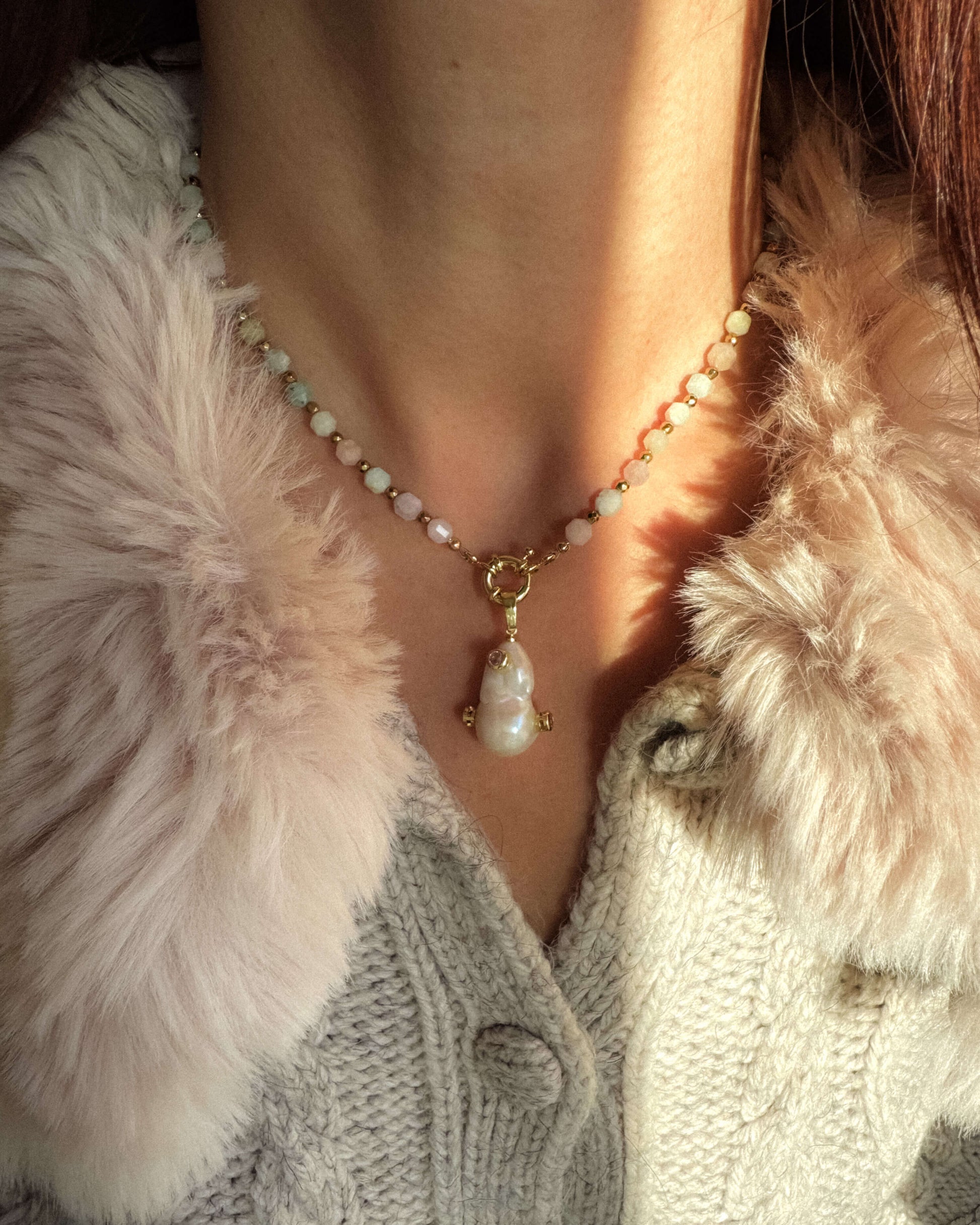 - Colier unicat din morganit și hematite de 3 mm pe fir din inox siliconat; pandant perlă naturală baroc cu zirconii lila aplicate