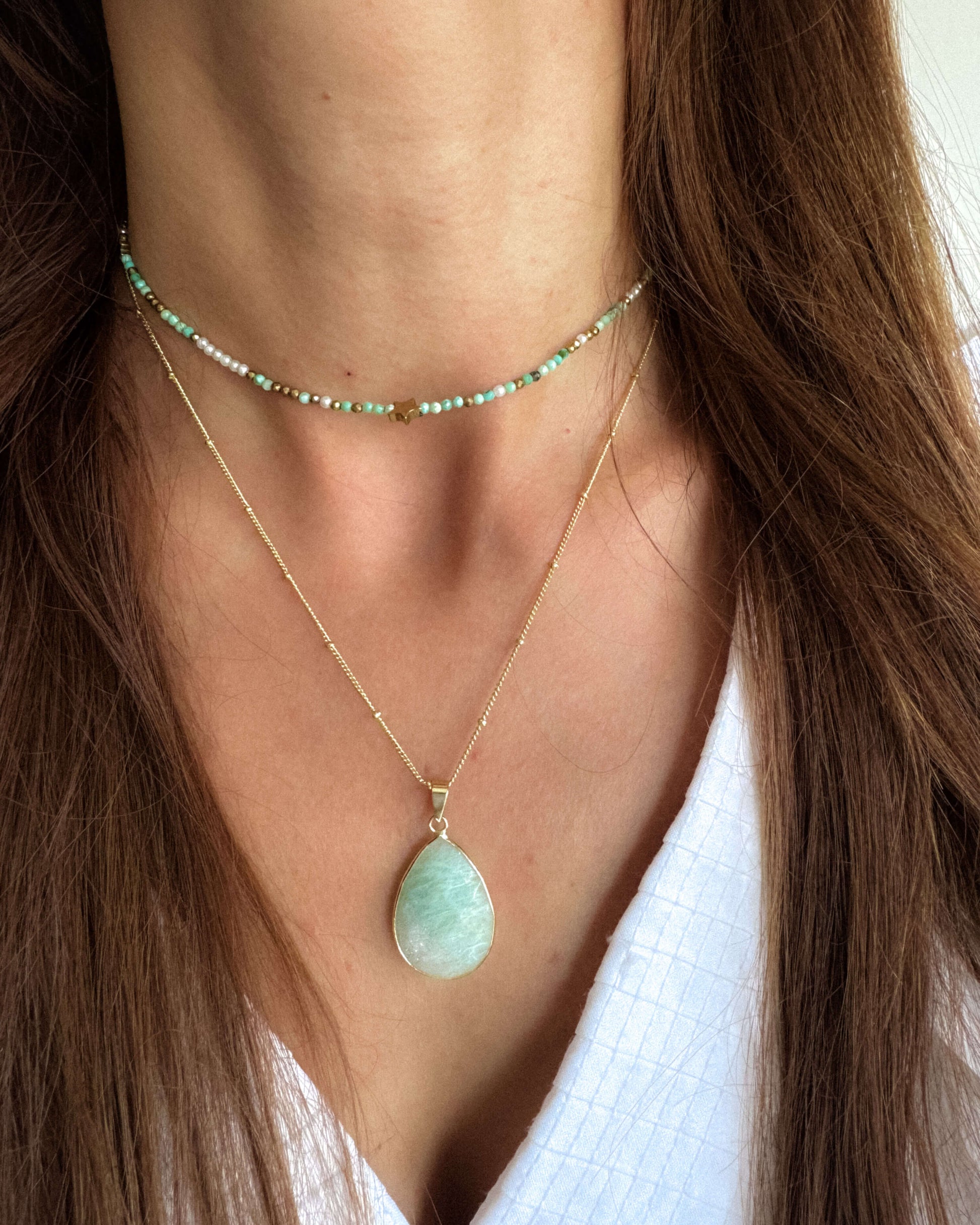 - Colier cu pandant cu două fețe din amazonit, alamă electroplacată cu aur 18 karate