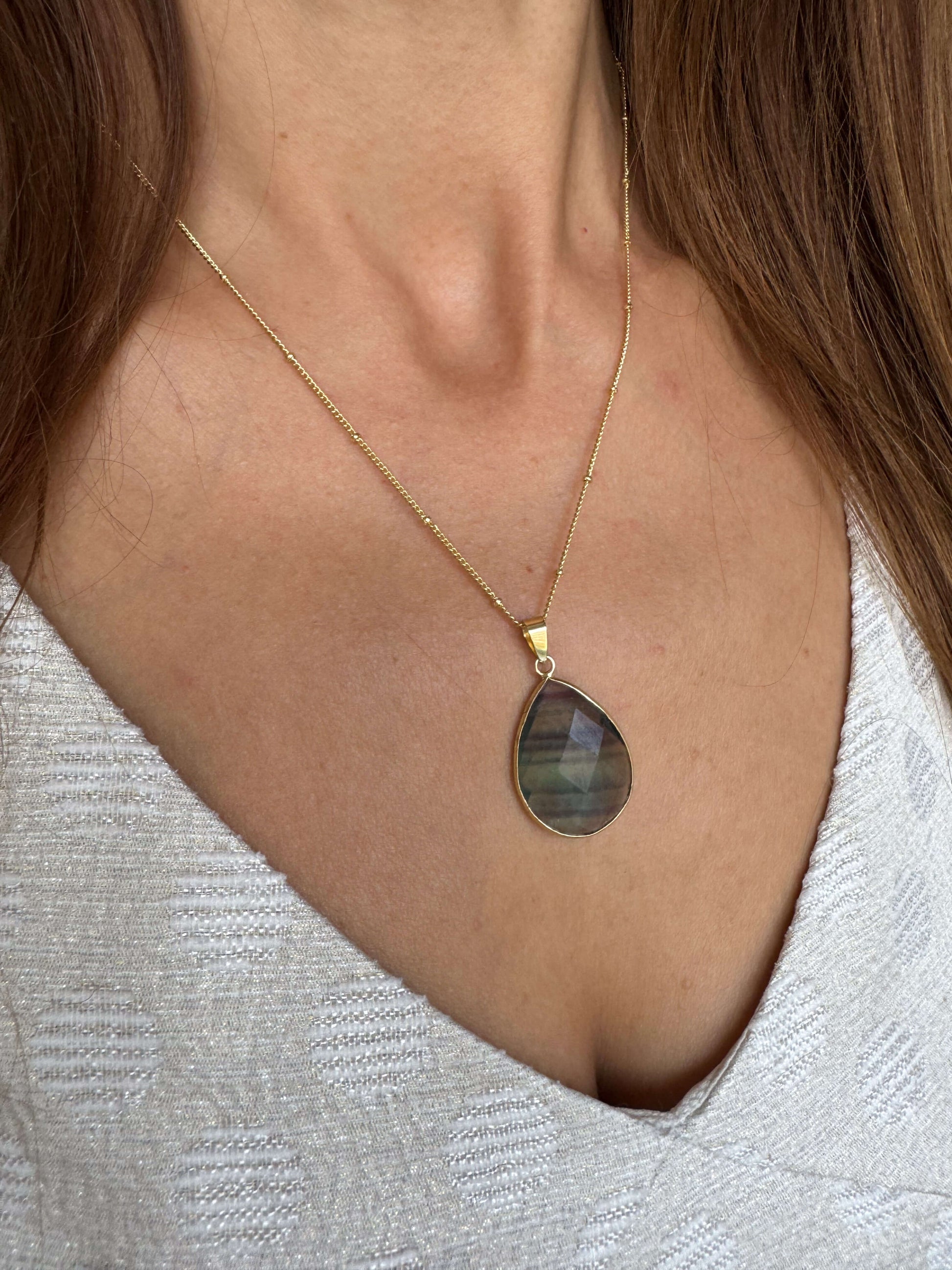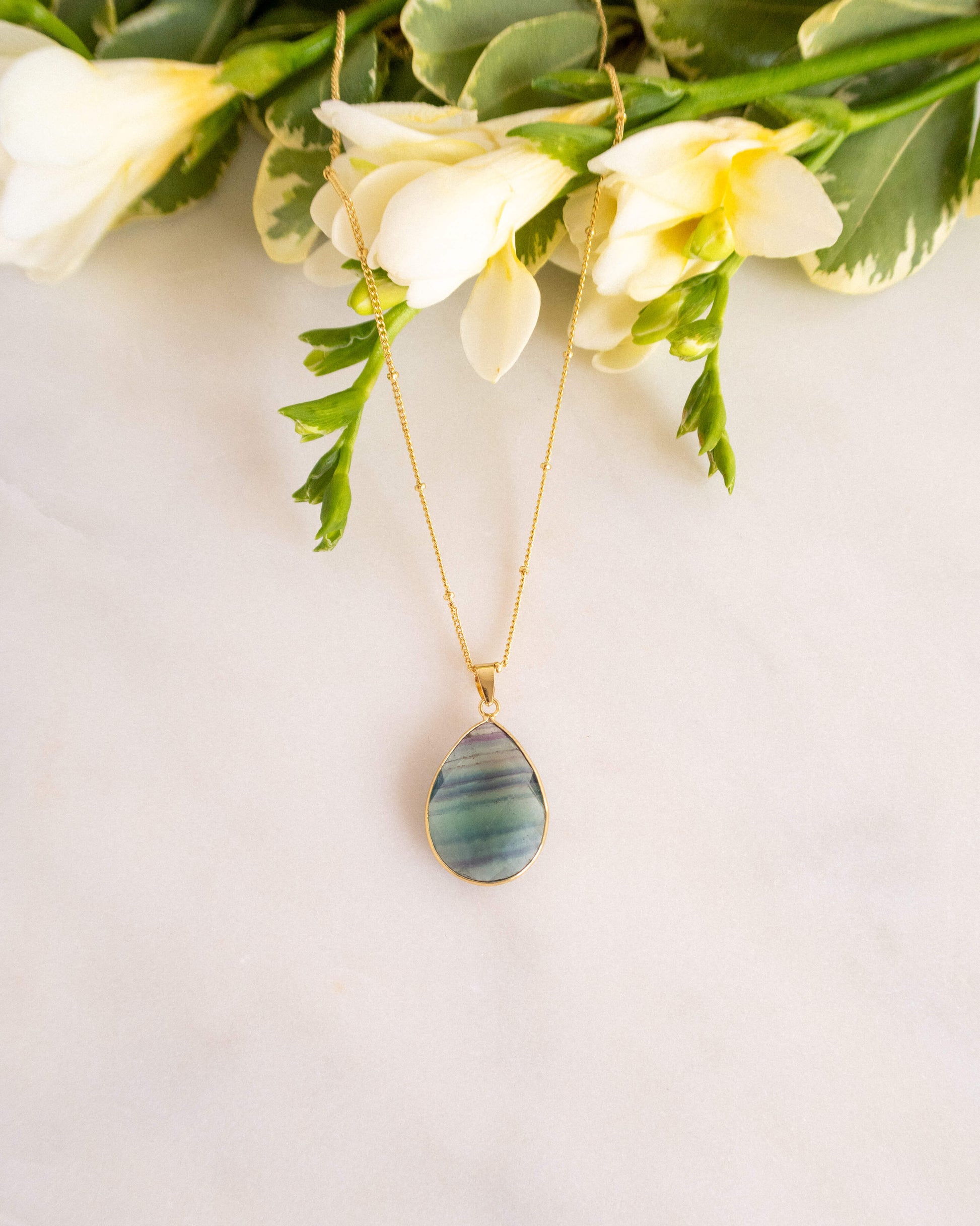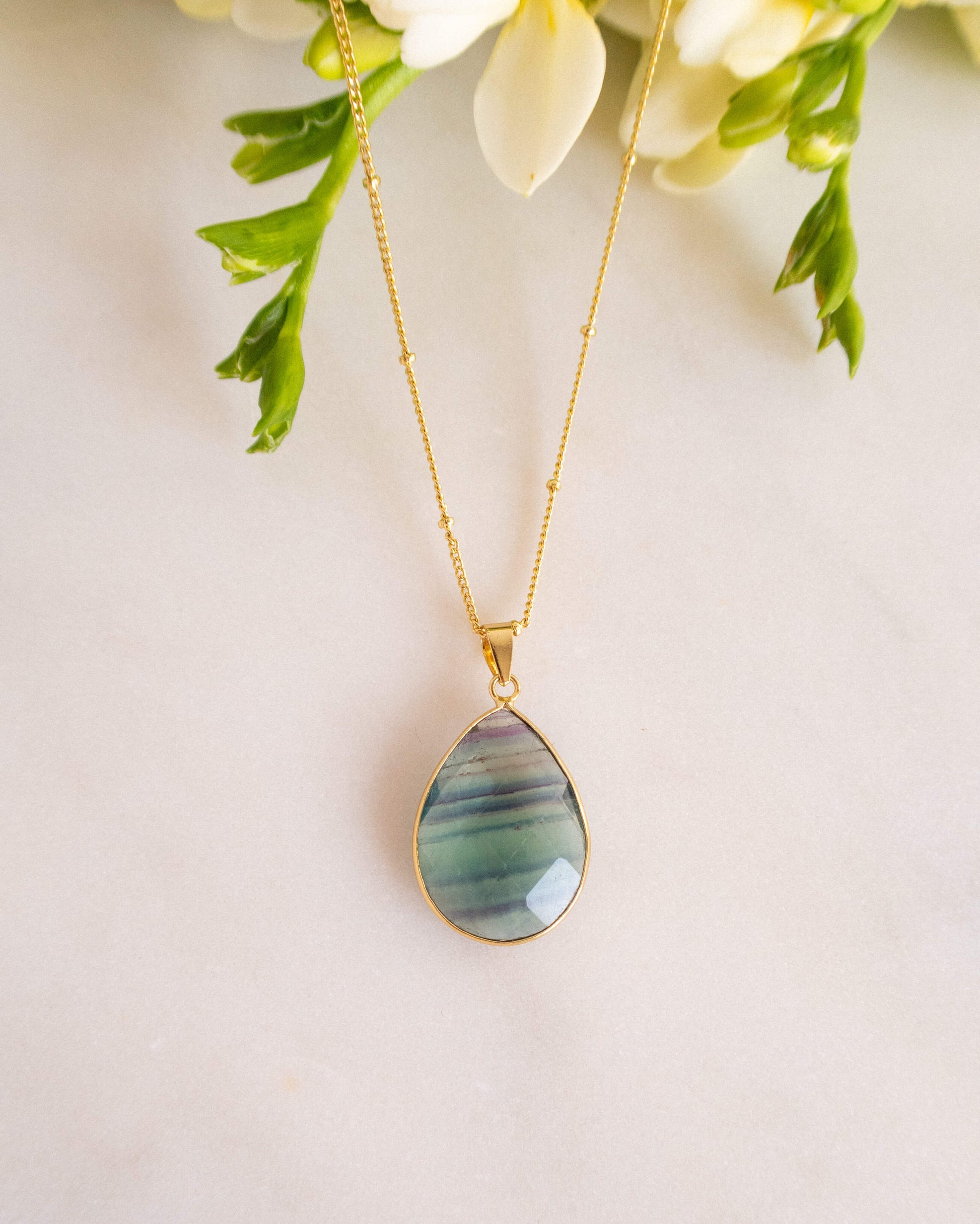- Colier cu pandant cu 2 fețe din flourit, alamă electroplacată cu aur 18 karate