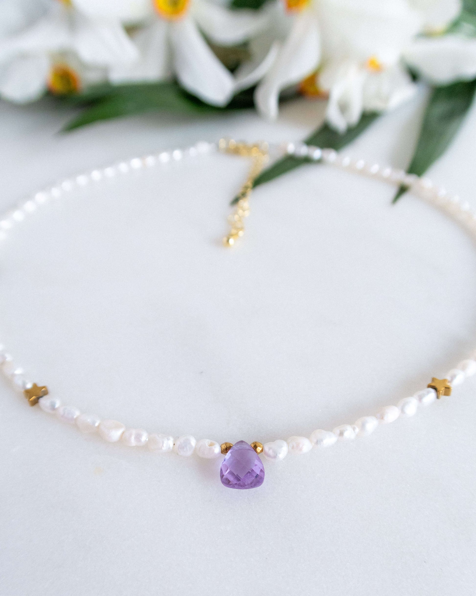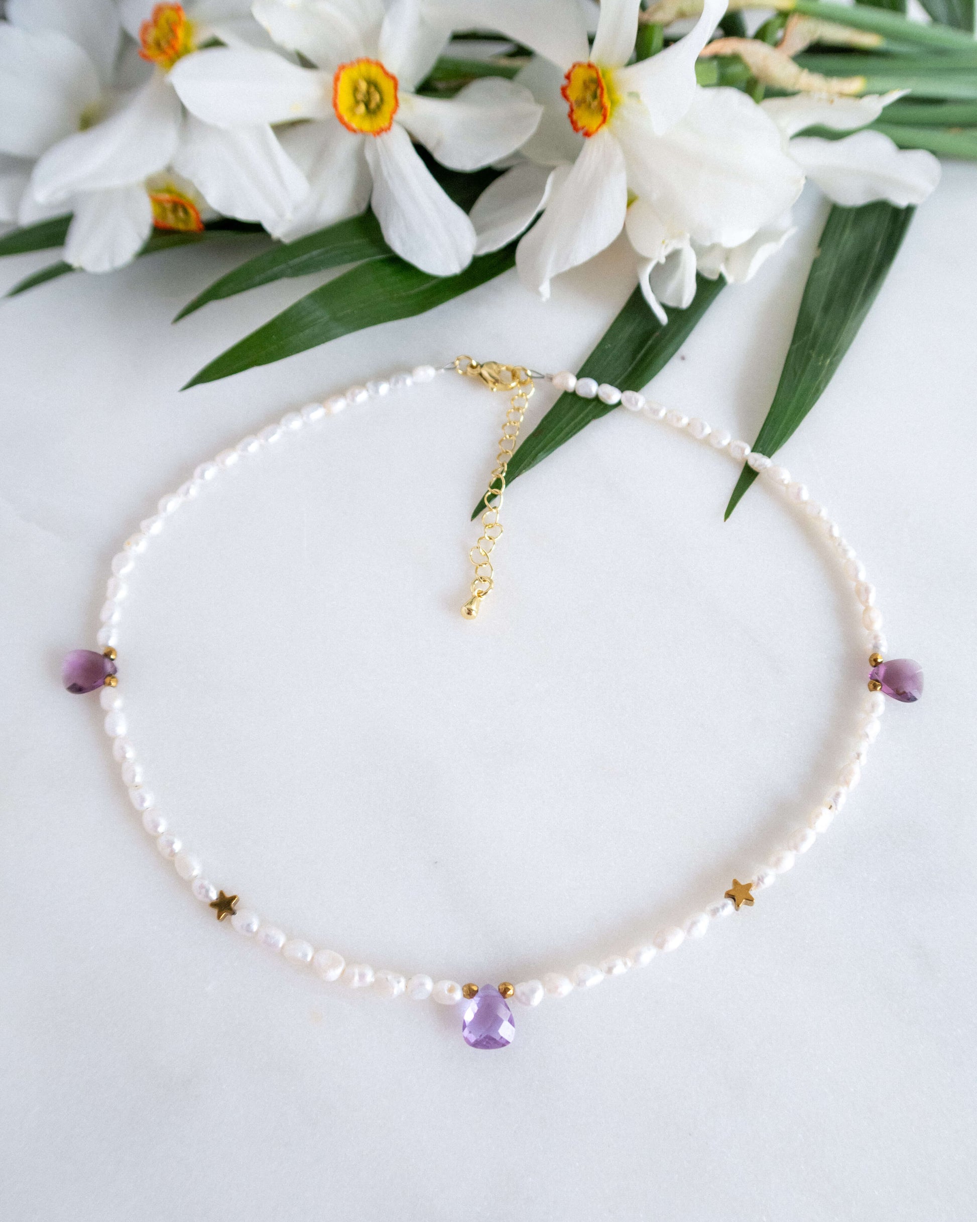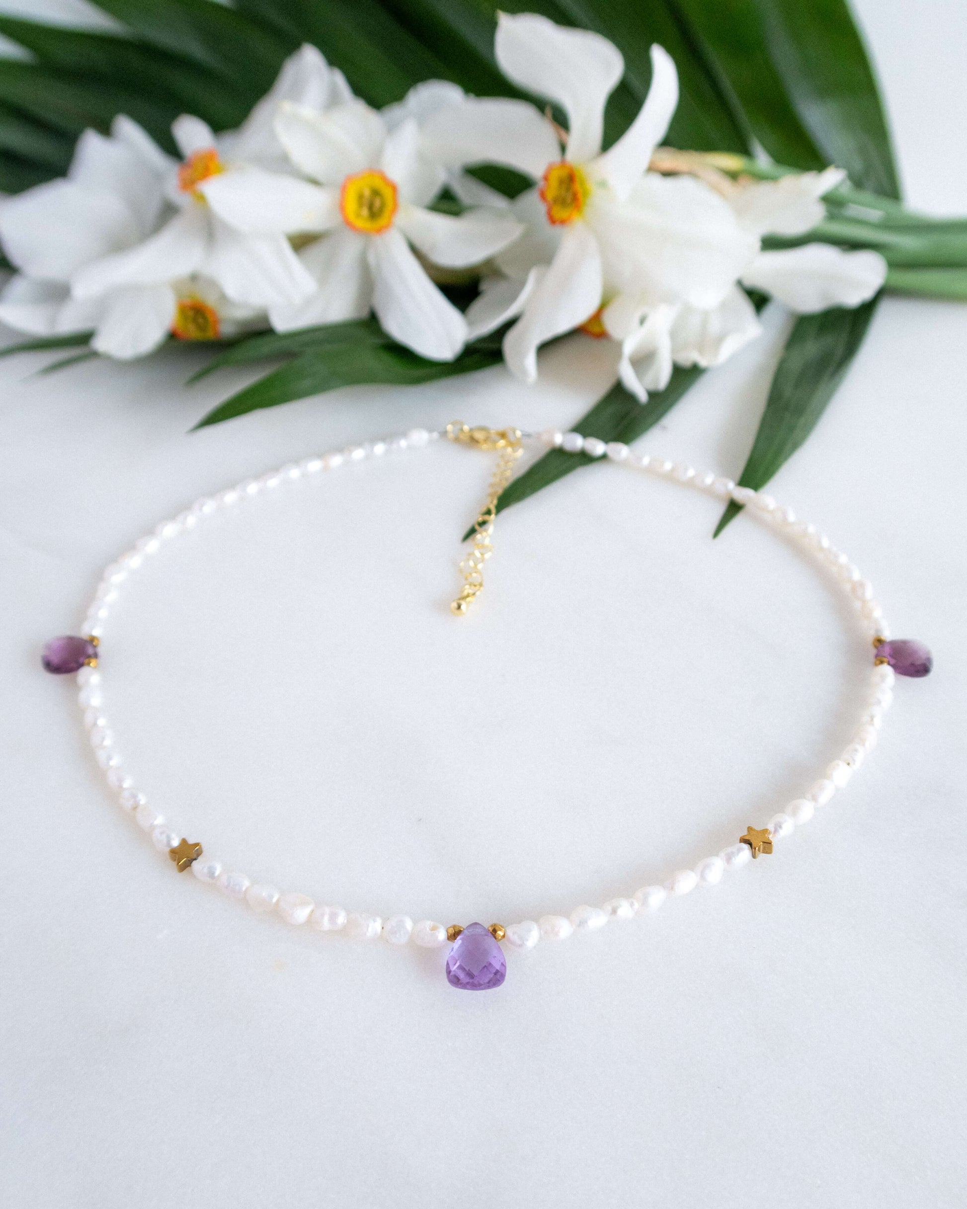 - Colier unicat la baza gâtului din perle naturale mici de 5-5.5/3-4 mm, briolete din ametist, stele din hematite și hematite de 2 mm pe fir din inox siliconat