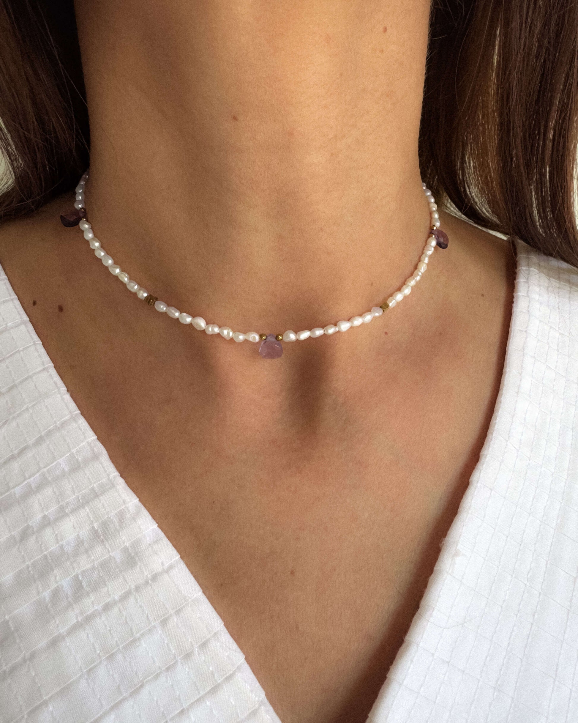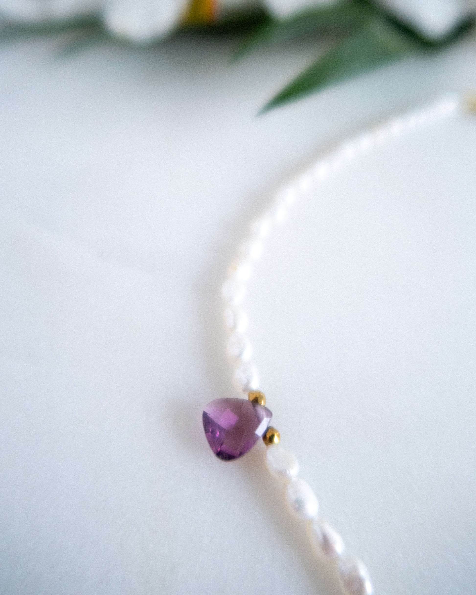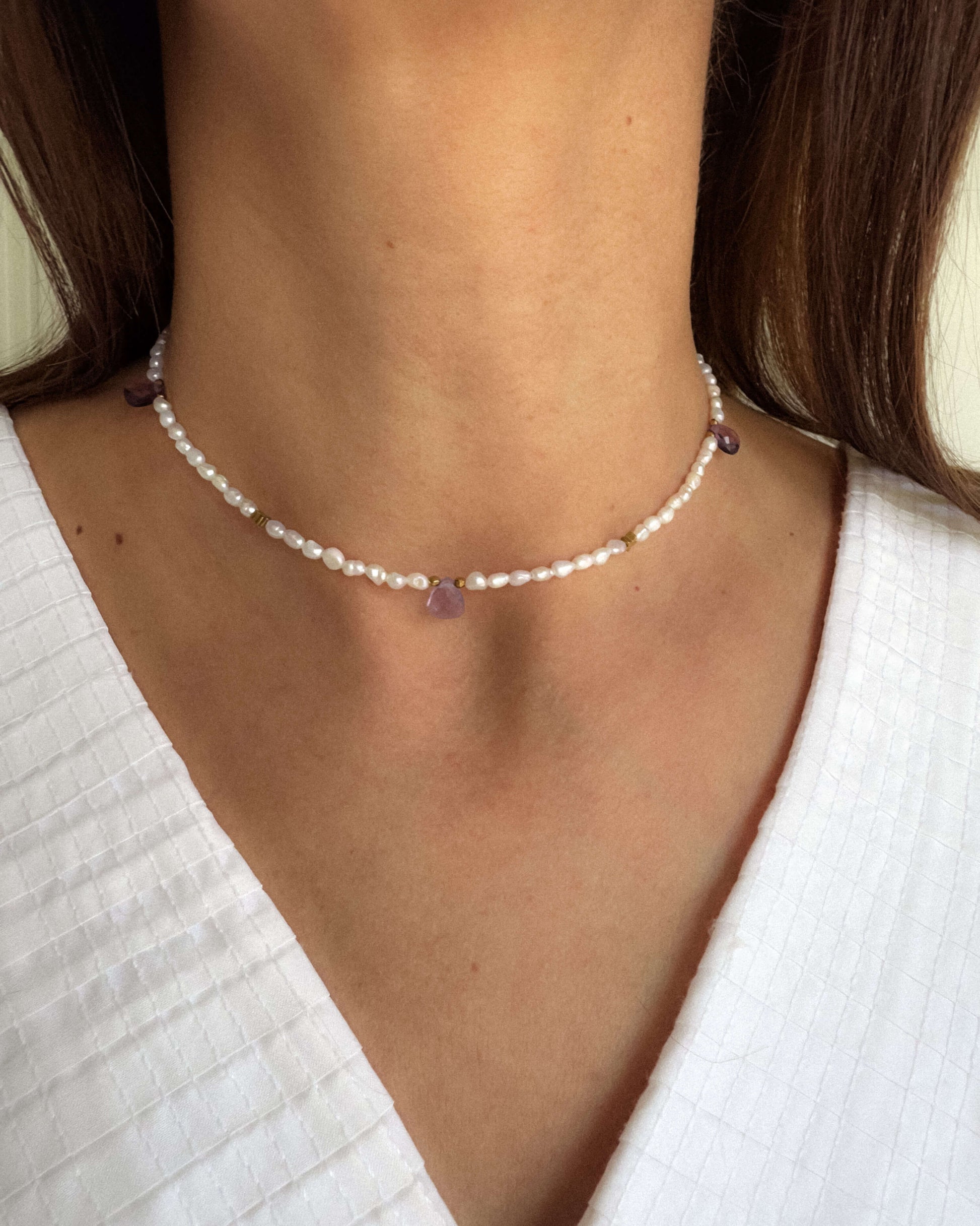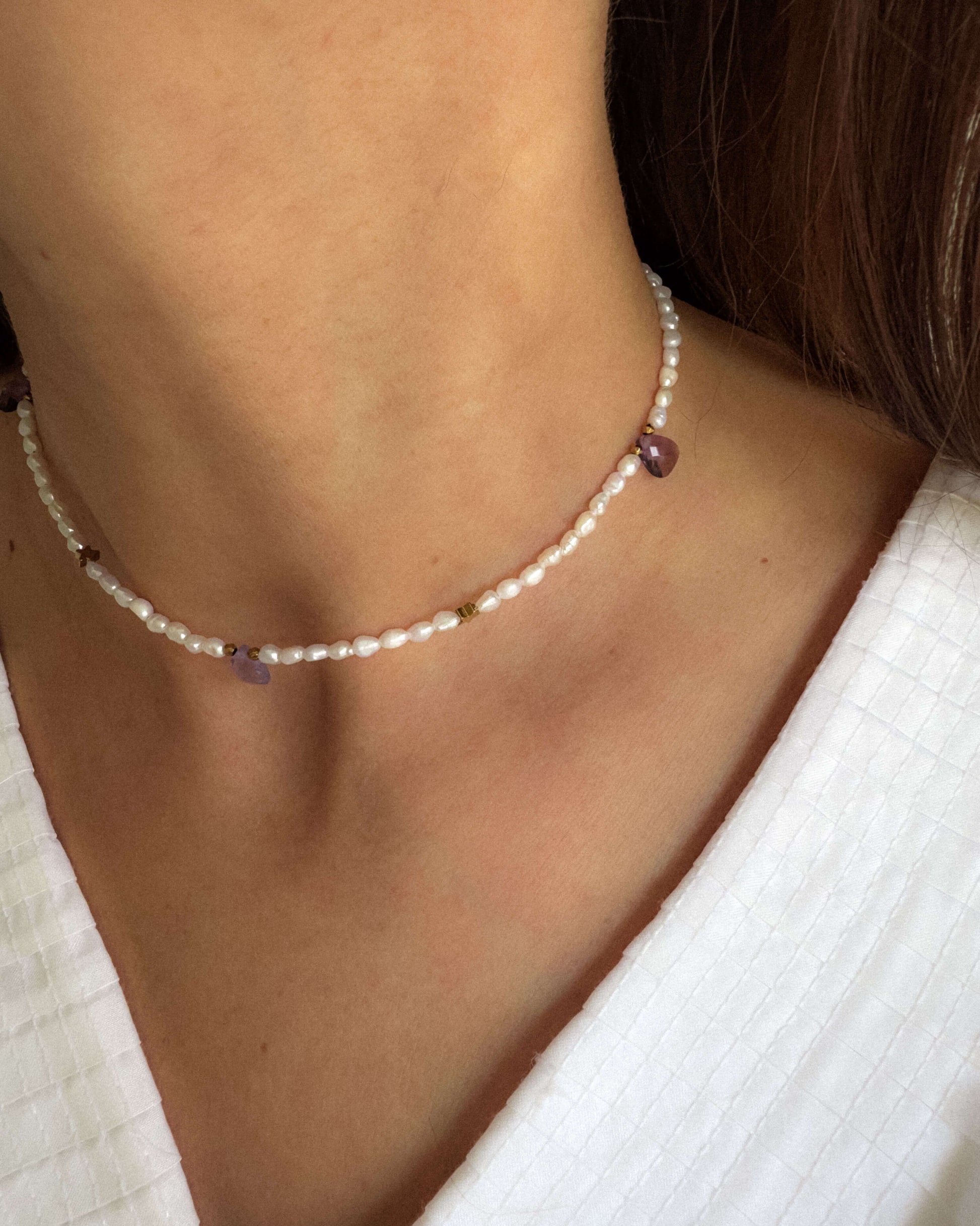 - Colier unicat la baza gâtului din perle naturale mici de 5-5.5/3-4 mm, briolete din ametist, stele din hematite și hematite de 2 mm pe fir din inox siliconat