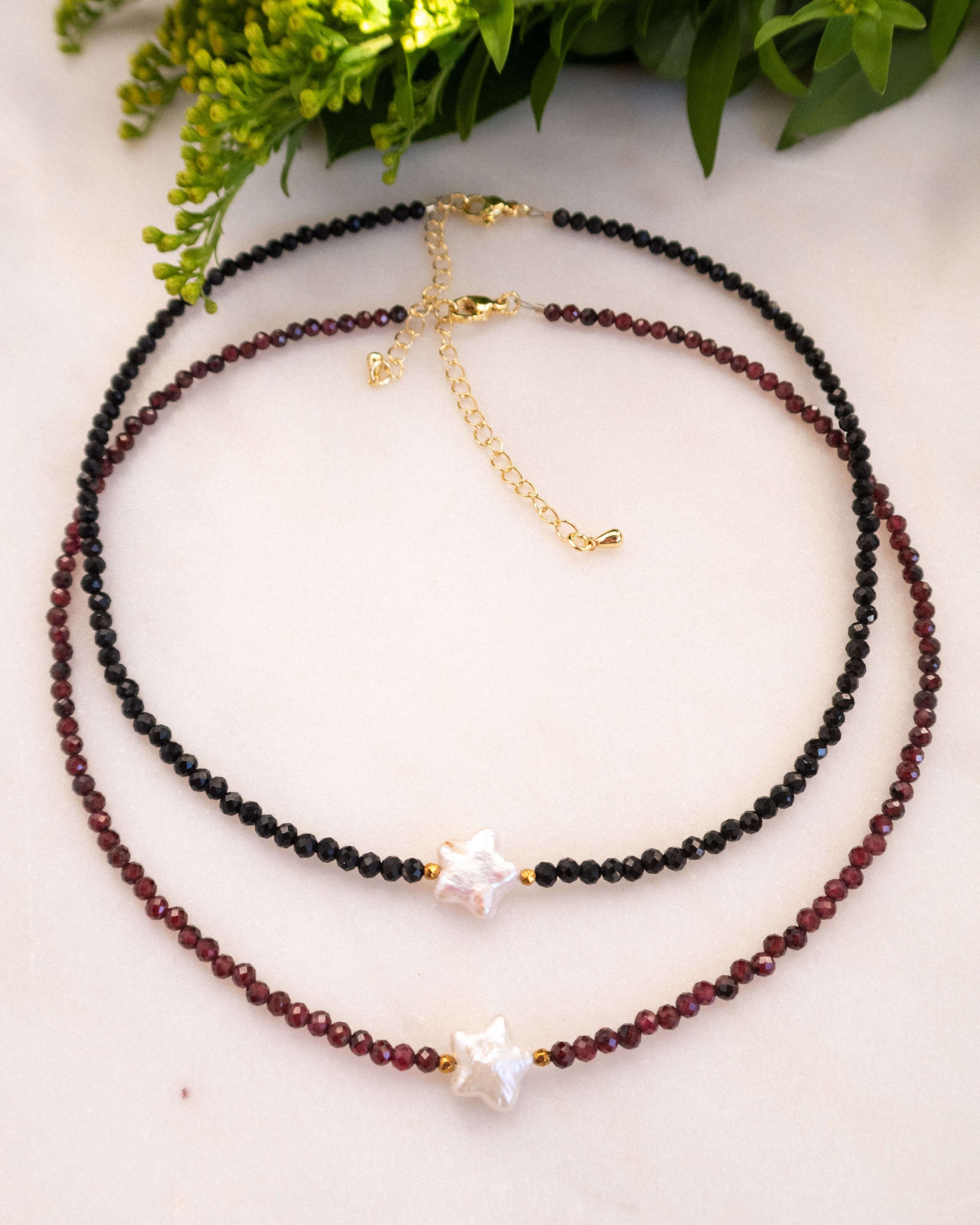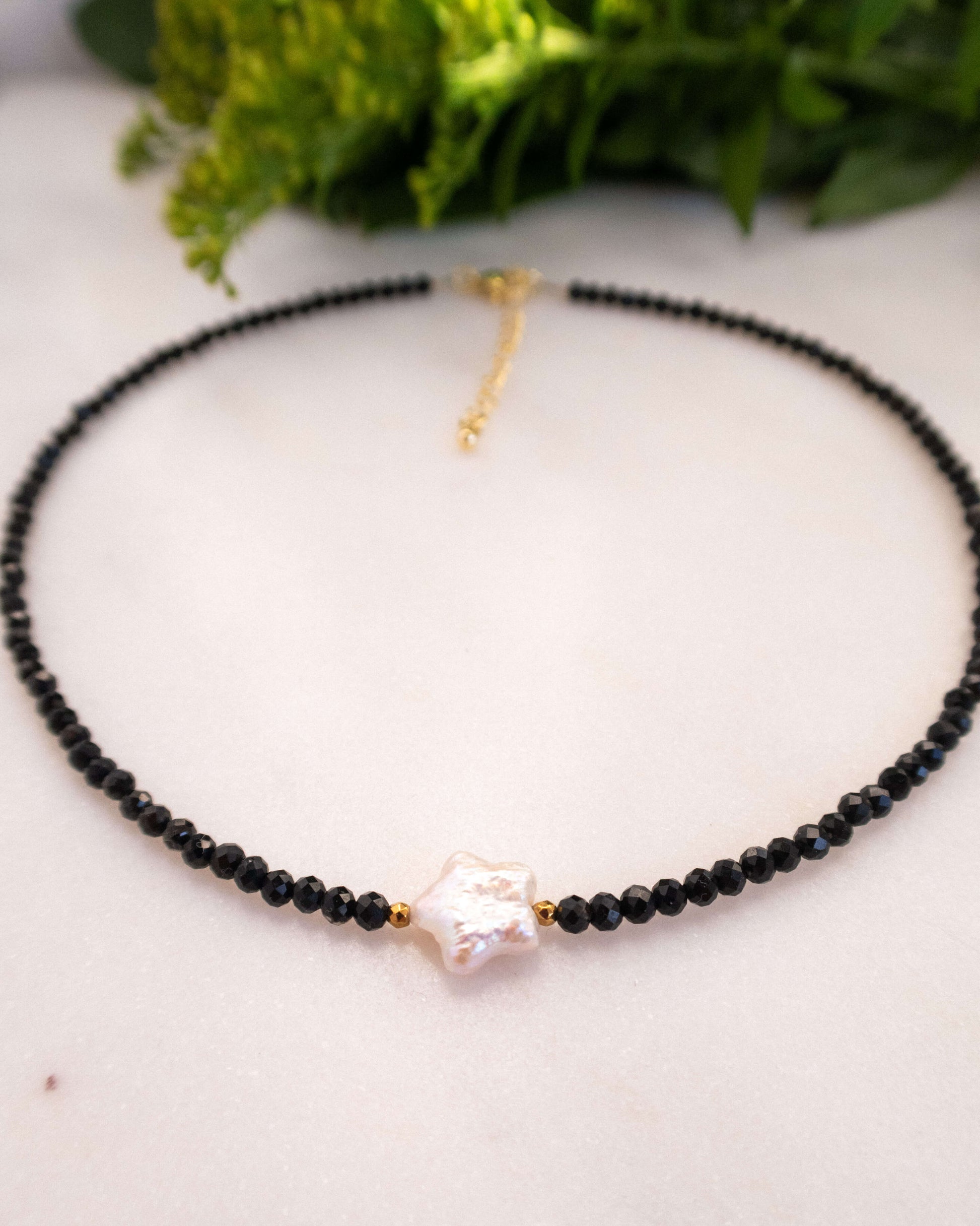 - Colier cu stea din perlă naturală de cultură, onix de 3,5 mm și hematite de 2,5 mm pe fir din inox siliconat