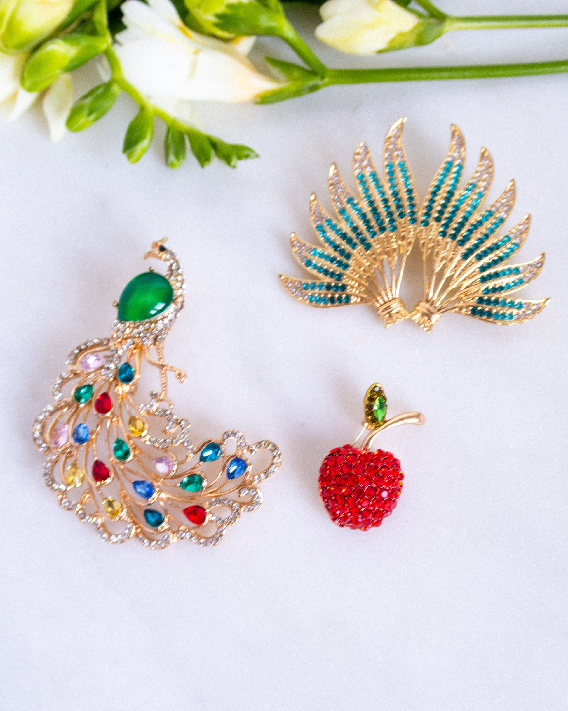 Broșă măr cu zirconii din aliaj metalic special pentru bijuterii.