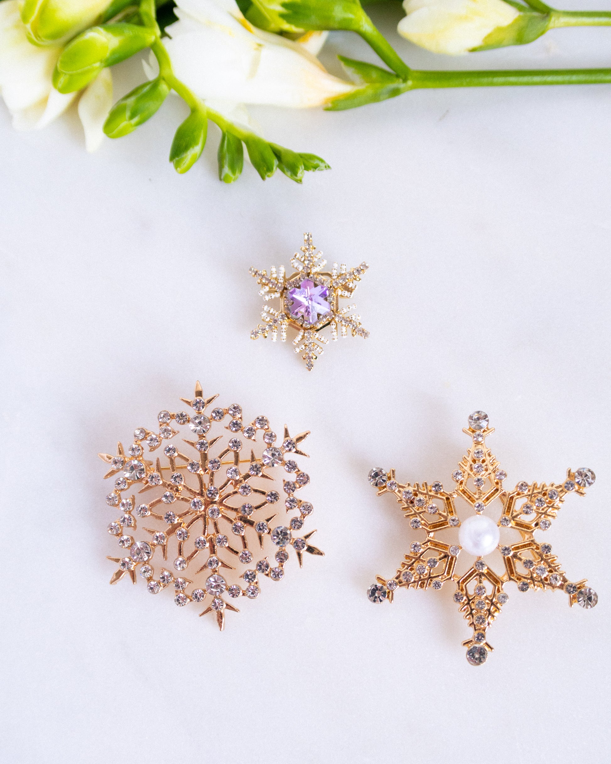 3 Broșe fulg de zăpadă cu zirconii și perlă artificială din aliaj metalic special pentru bijuterii.