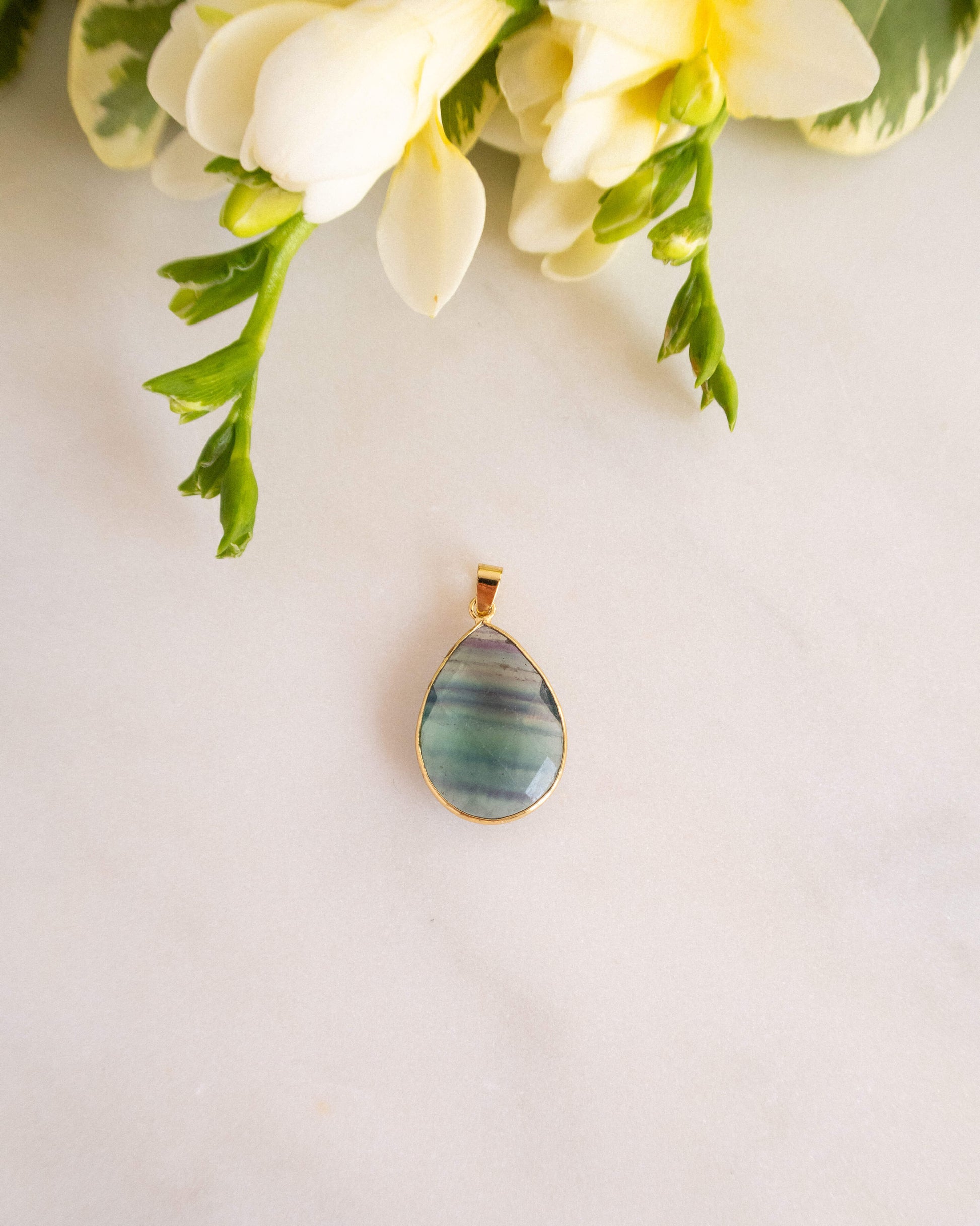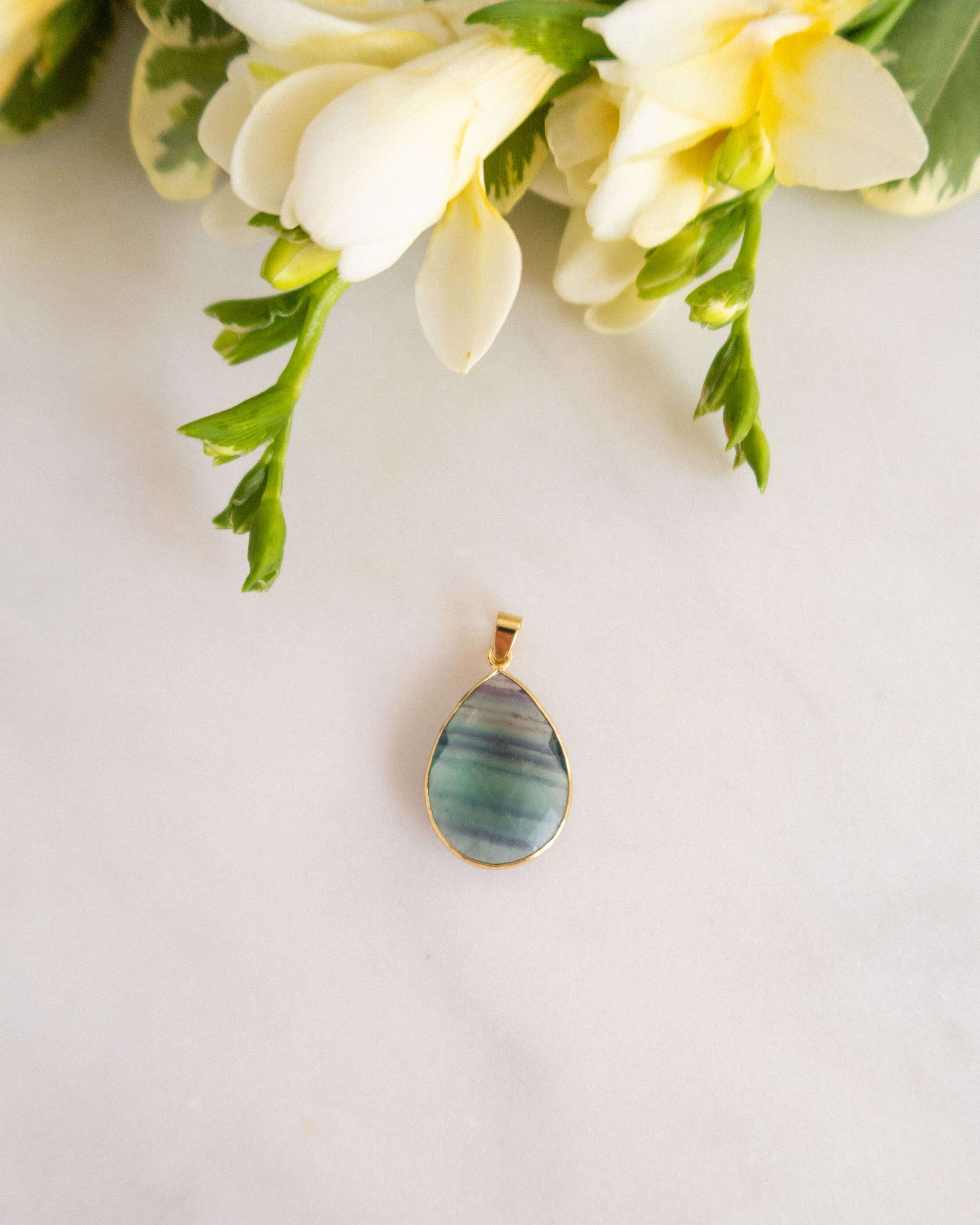 - Pandant cu 2 fețe din fluorit, alamă electroplacată cu aur 18 karate