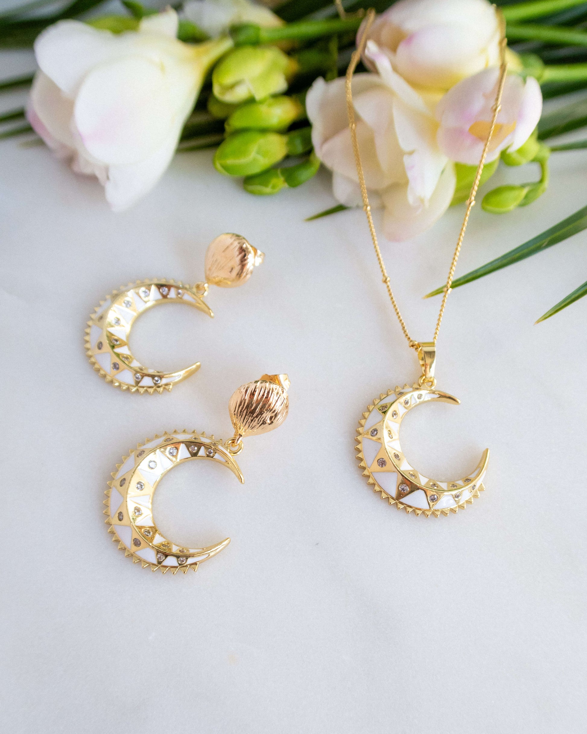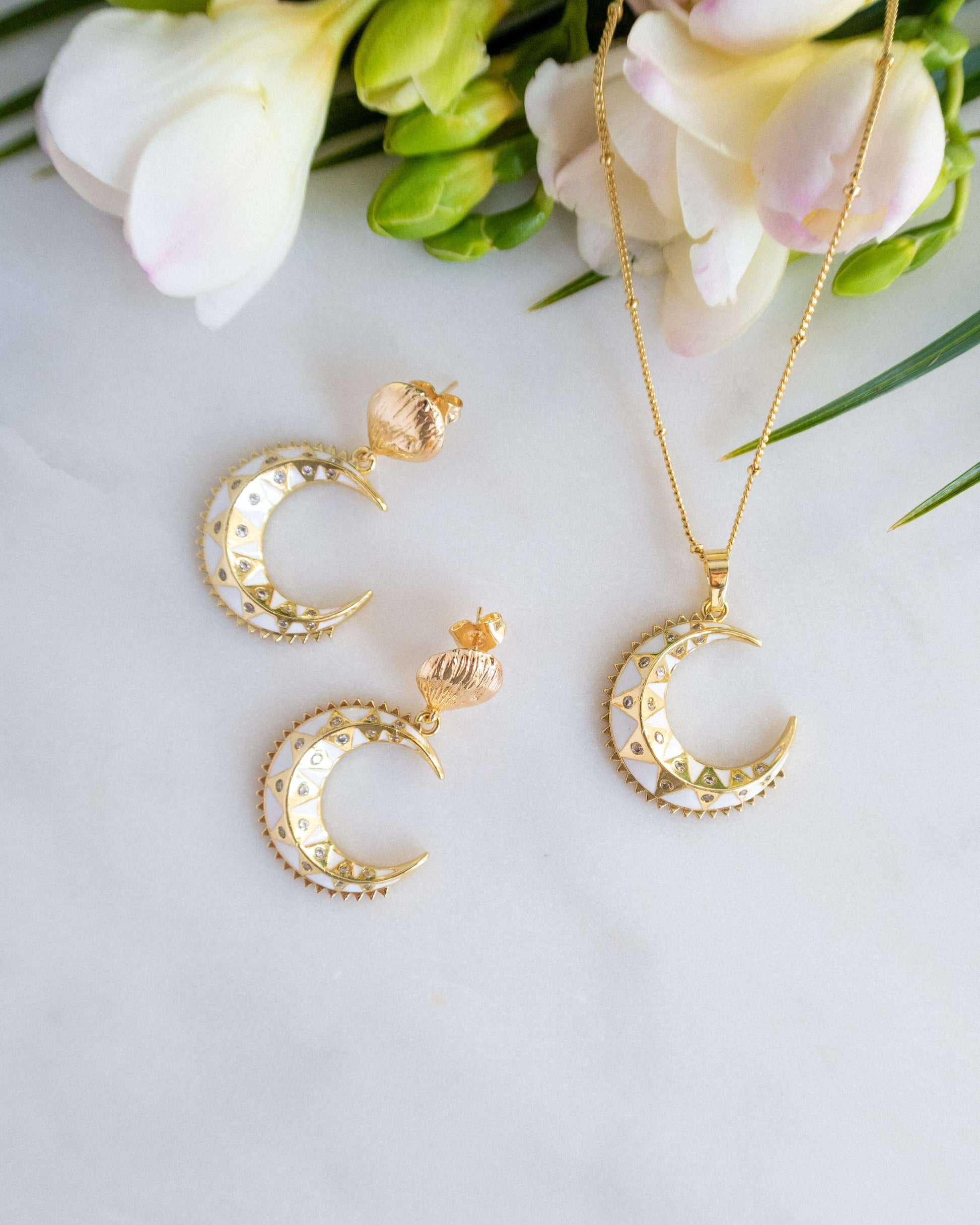 - Set format din cercei și colier cu semilună emailată cu zirconii